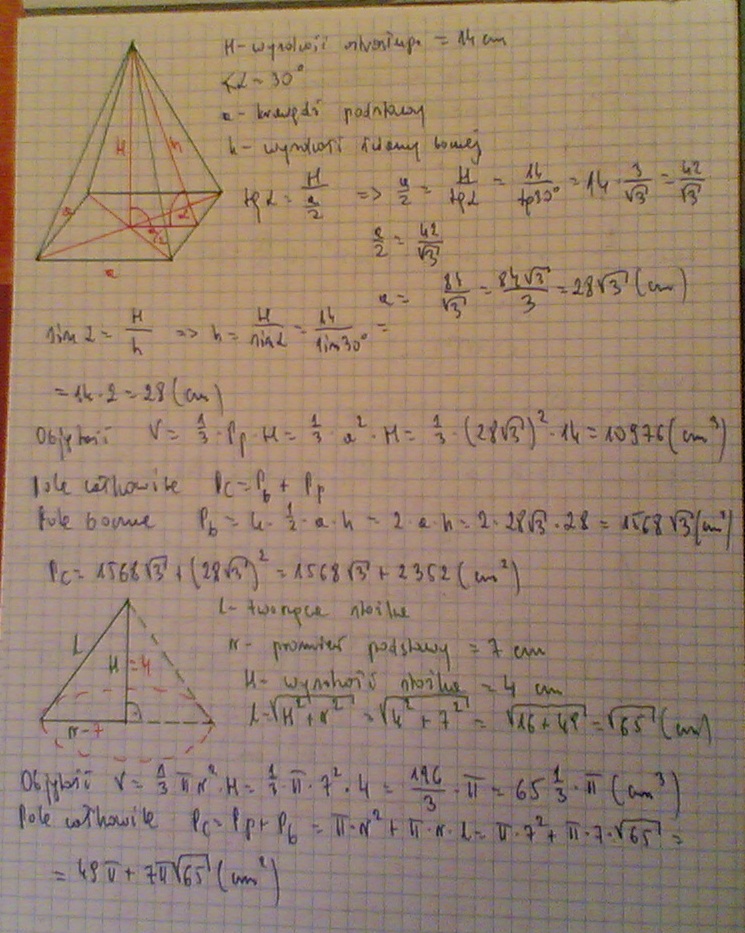 po sugestii werner dodatkowo obliczyłem pole i objętość stożka dla H=7 cm i r=4 cm.