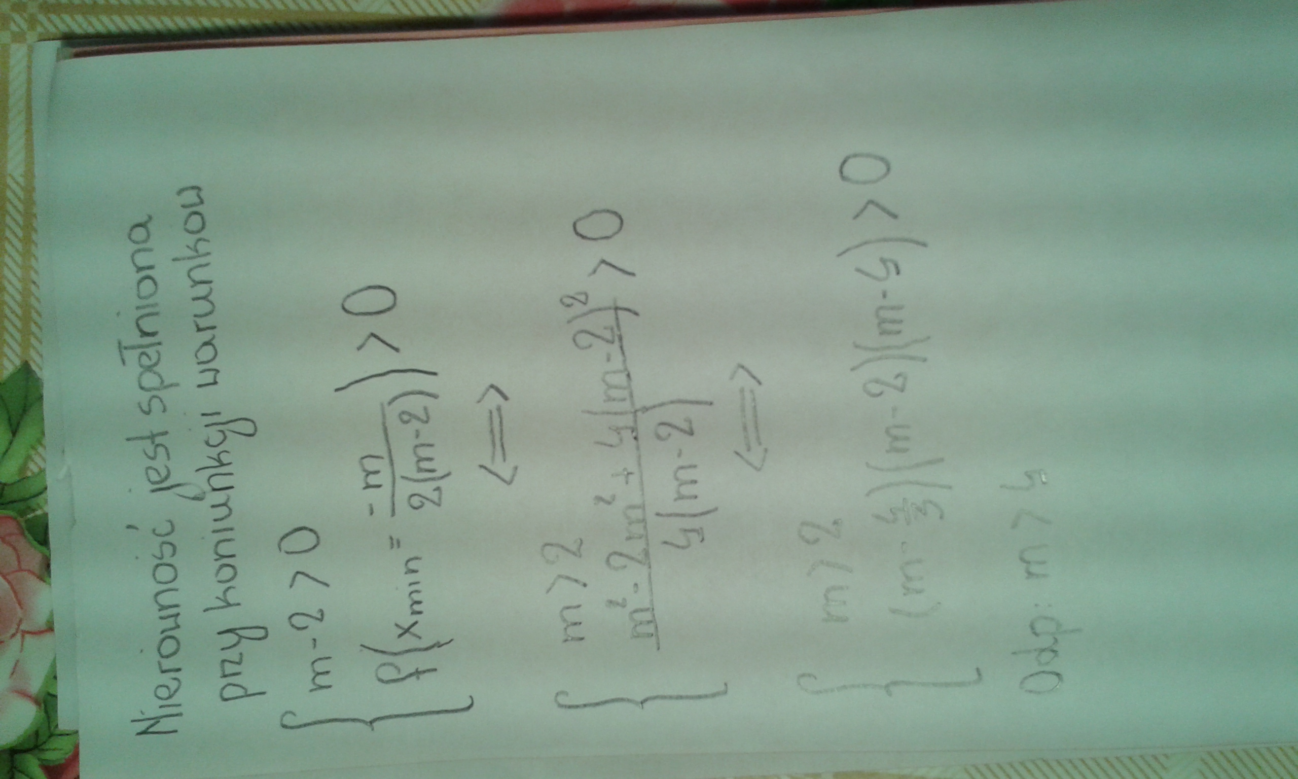 Wyznacz wszystkie wartości parametru m dla których nierówność : (m-2)x^2 + mx + (m-2) wieksze od 0 jest spełniona przez każdą liczbę rzeczywistą.