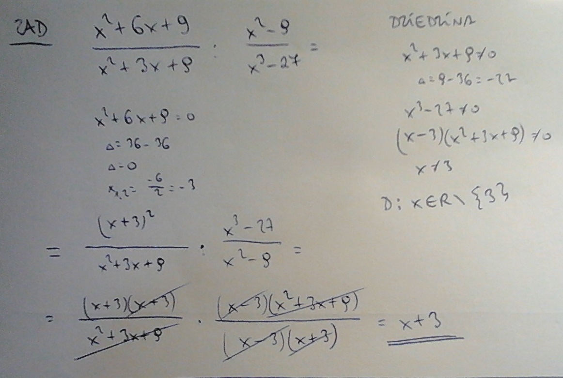 Wykonaj działania x kwadrat +6x+9 kreska ulamkowa x kwadrat+3x+9 podzielić x kwadrat-9kreska ulamkowa x do trzeciej -27
