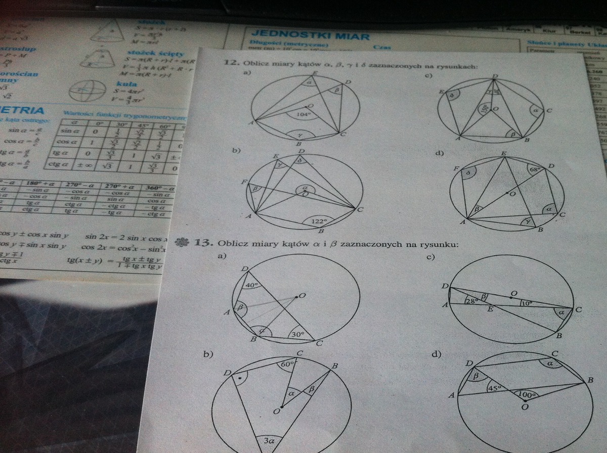 Oblicz miary katów alfa i beta zaznaczonych na rysunkach