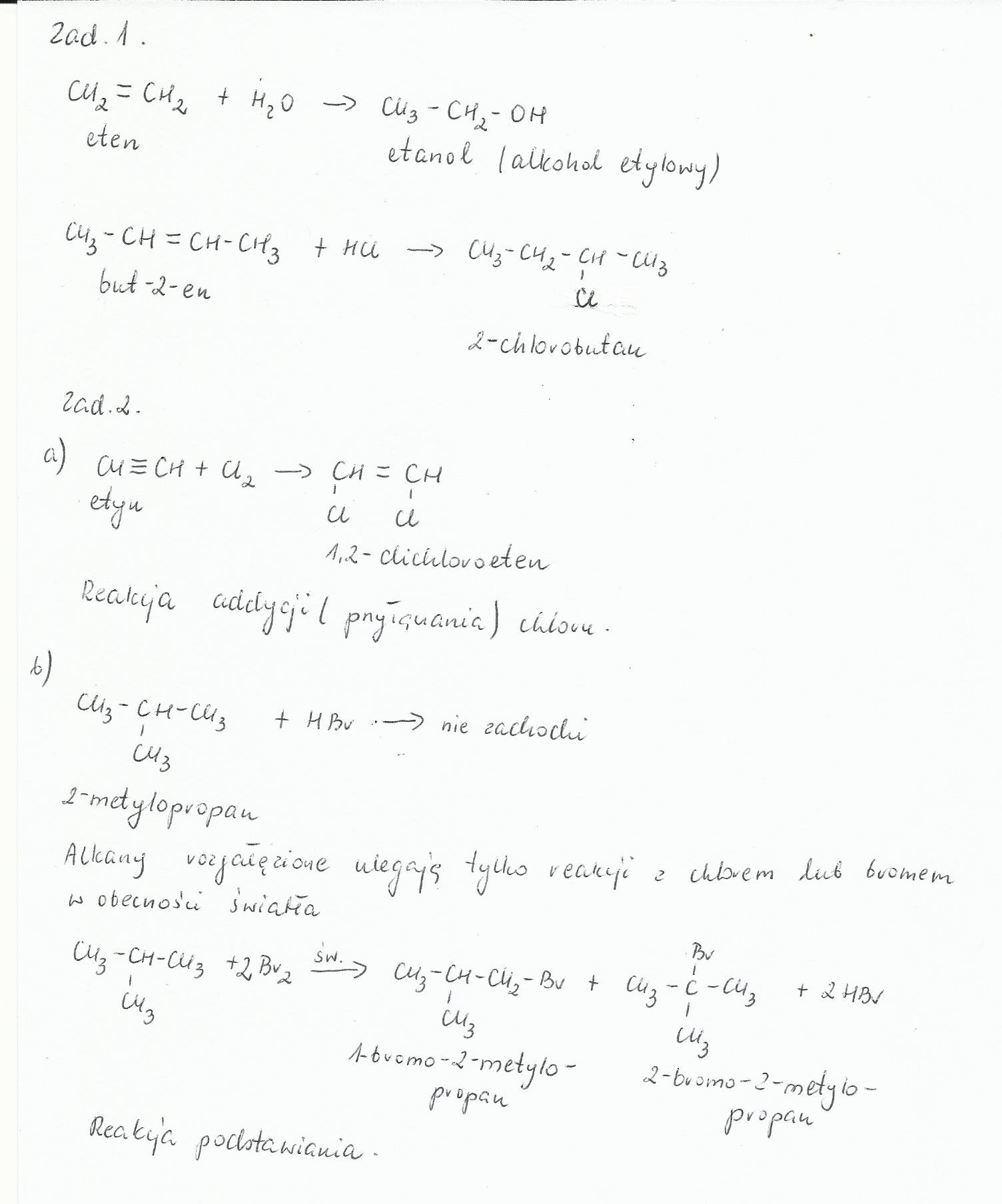 1.Napisz reakcję etenu z wodą oraz 2-butenu z HCl, podaj nazwy produktów.