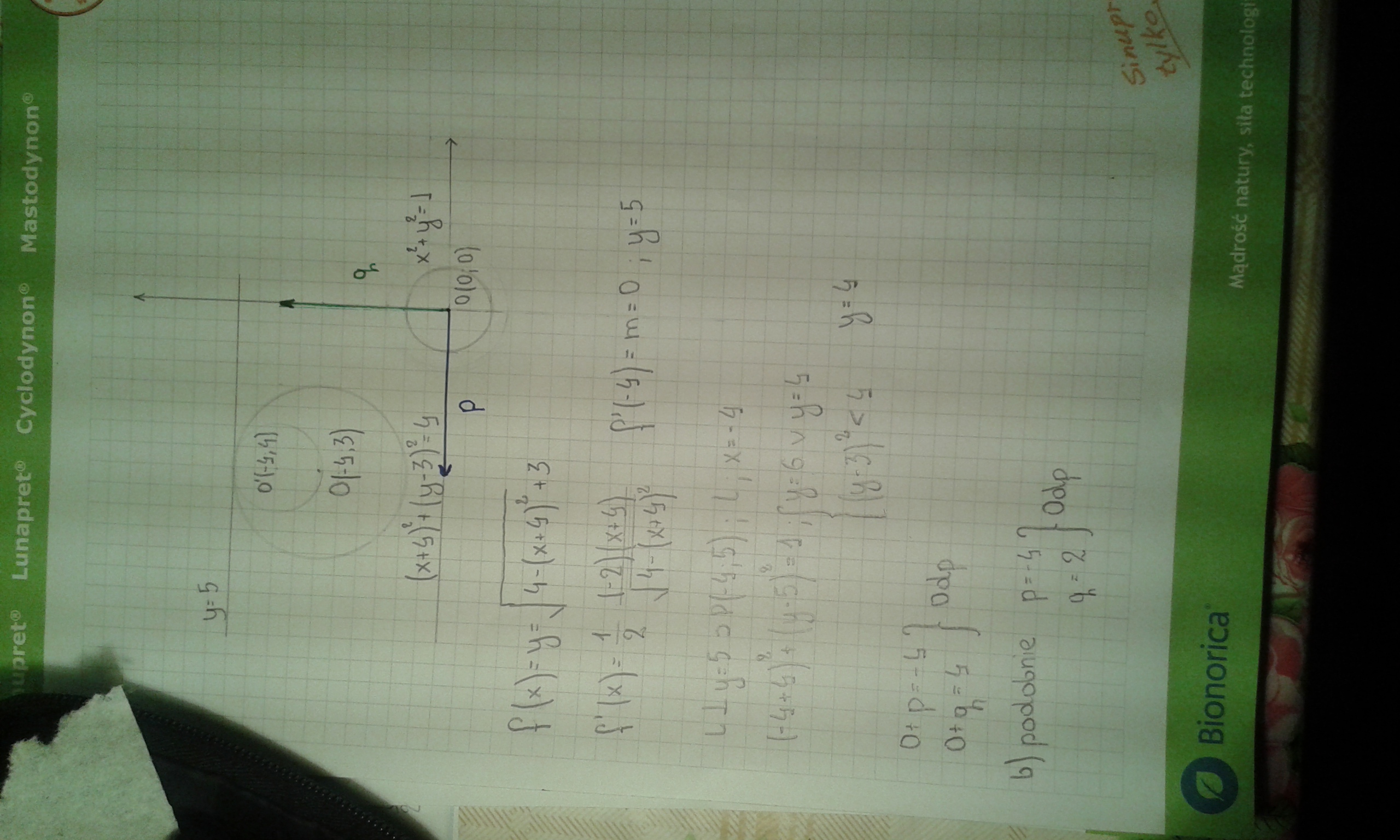 Oblicz współrzędne wektora w , o który należy przesunąć okrąg o równaniu x ^ + y^ =1 tak by jego obraz był okręgiem stycznym wewnętrznie do okręgu o równaniu (x +4)^ +(y-3)^=4 w punkcie P gdy :