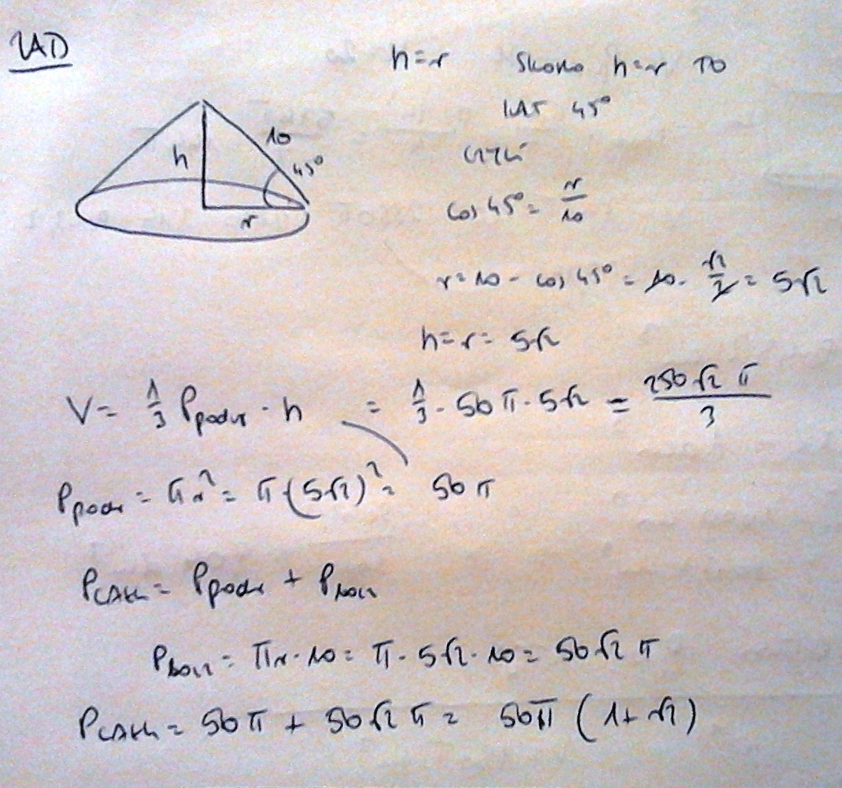 Przekrojem osiowym stożka o tworzącej 10 cm jest trojkat prostokątny rownoramienny.Oblicz pole powierzchni calkowitej i objetość tego stożka .Wykonaj rysunek