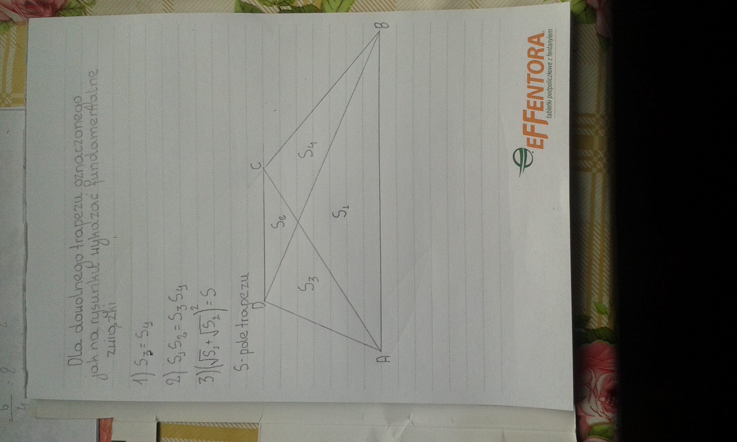 1) Pola trójkątów: ADB i ACB są równe ( bo oba trójkąty mają taką samą wysokość i podstawę AB) Pole trójąta ADB = S1 + S3 Pole trójąta ACB = S1 + S4 ; więc, ponieważ poleADB = poleACB S1 + S3 = S1 + S4 S3 = S4 ============================== 2) Niech punkt przecięcia się przekątnych nazywa się "P" Oznaczmy: kąt APB = kąt DPC = alfa. Poszczególne pola wynoszą: S1 = (1/2) * |AP| * |BP| * sin(alfa) S2 = (1/2) * |DP| * |CP| * sin(alfa) S3 = (1/2) * |AP| * |DP| * sin(180 - alfa) S4 = (1/2) * |BP| * |CP| * sin(180 - alfa) Iloczyny: S1 * S2 = (1/4) * |AP| * |BP| * |DP| * |CP| * sin^2(alfa) S3 * S4 = (1/4) * |AP| * |BP| * |DP| * |CP| * sin^2(180 - alfa) Ponieważ sin(alfa) = sin(180 - alfa) to widać, że zachodzi: S1 * S2 = S3 * S4 ============================== 3) Po podniesieniu do kwadratu i uwzględnieniu związku (2) powyżej dostajemy: Lewa strona = S1 + S2 + 2 * pierwiastek(S3 * S4) Ale ponieważ na podstawie (1) mamy: S3 = S4 = sigma to dalej dostajemy: Lewa strona = S1 + S2 + 2 * pierwiastek(sigma^2) = S1 + S2 + S3 + S4 = S. ==============================