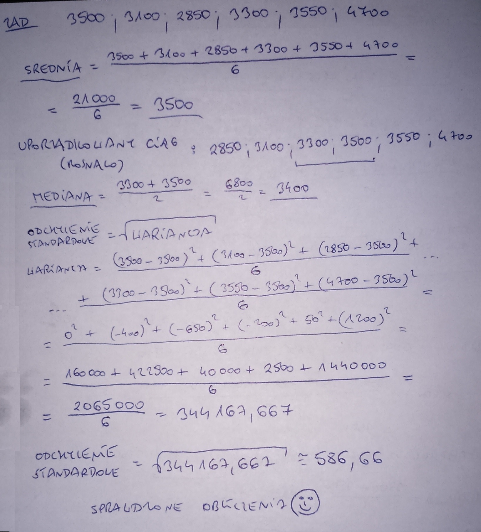 . Waga urodzeniowa sześciu noworodków urodzonych jednego dnia na oddziale pewnego szpitala była równa (w gramach): 3500, 3100, 2850, 3300, 3550, 4700. Oblicz średnią wagę noworodków, medianę oraz odchylenie standardowe.