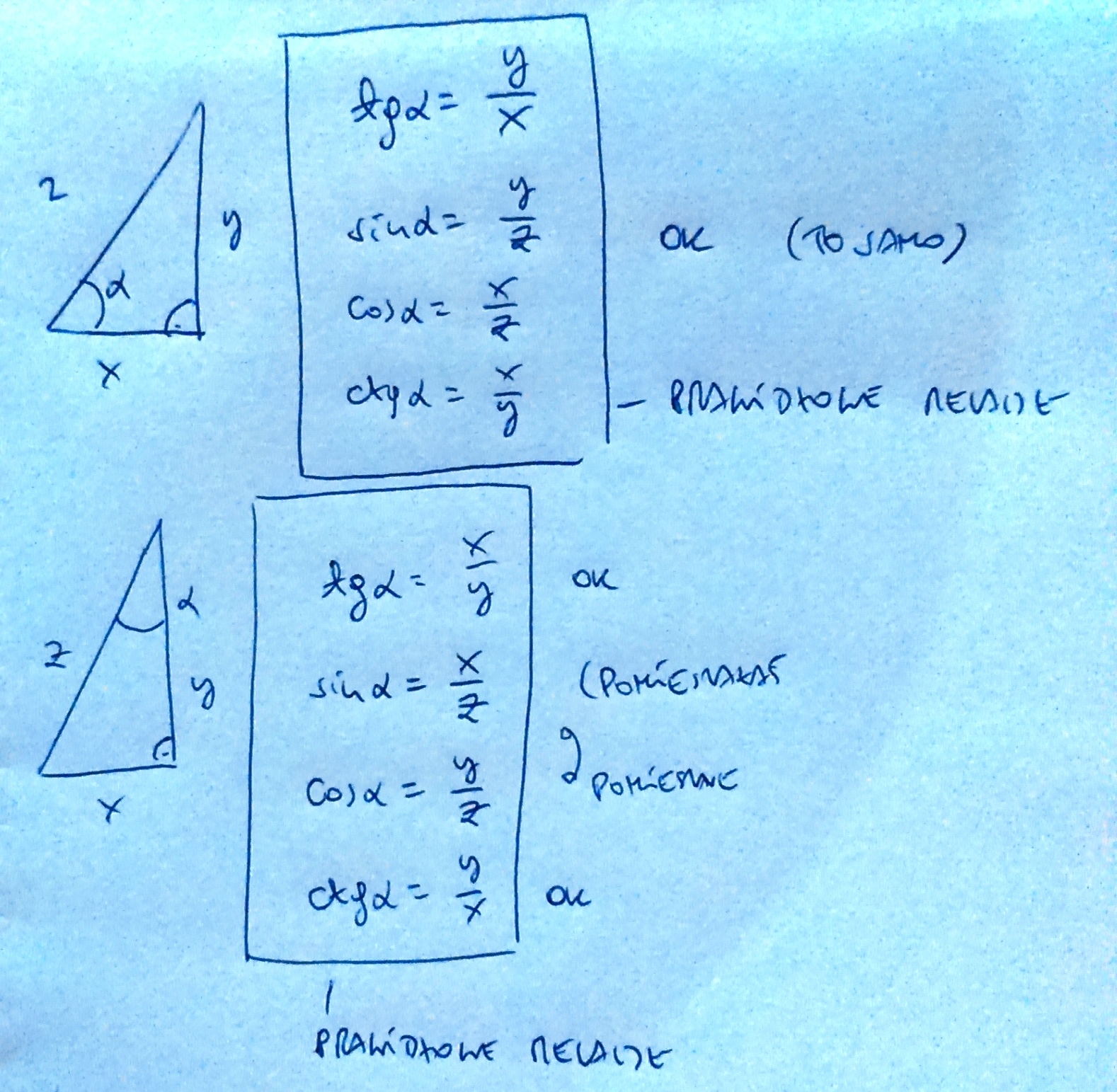 "sinus = przyprostokątna_DALSZA_od_kąta / przeciwprostokątna"