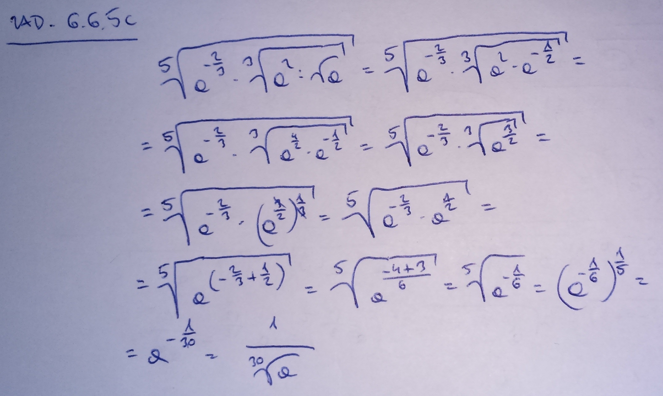 =\sqrt[5]{a^{-2/3}\cdot \sqrt[3]{a^2\cdot a^{-1/2}}}=a^{-2/15}\cdot a^{2/15}\cdot a^{-1/30}=a^{-2/15+2/15-1/30}=a^{-1/30}=\frac{1}{\sqrt[30]{a}}