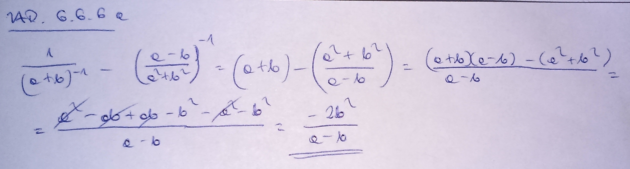 =(a+b)-\frac{a^2+b^2}{a-b}= \frac{(a-b)(a+b)-a^2-b^2}{a-b}=\frac{a^2-b^2-a^2-b^2}{a-b}=\frac{-2b^2}{a-b}