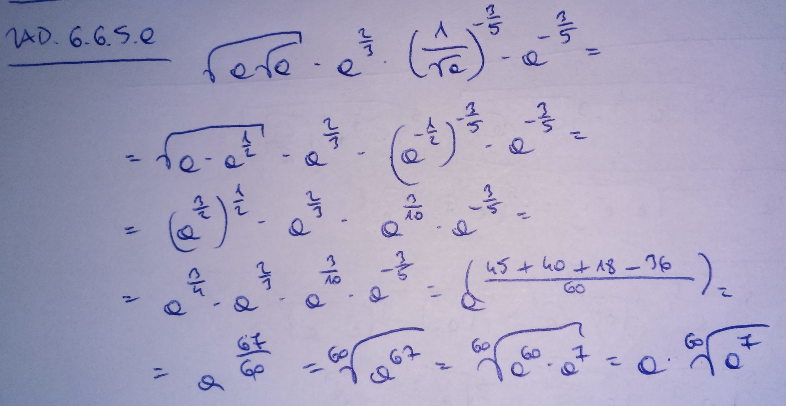 = a^{1/2}\cdot a^{1/4}\cdot a^{2/3}\cdot a^{3/10}\cdot a^{-3/5}=a^{1/2+1/4+2/3+3/10-3/5}= a^{67/60}=a\,\sqrt[60]{a^7}