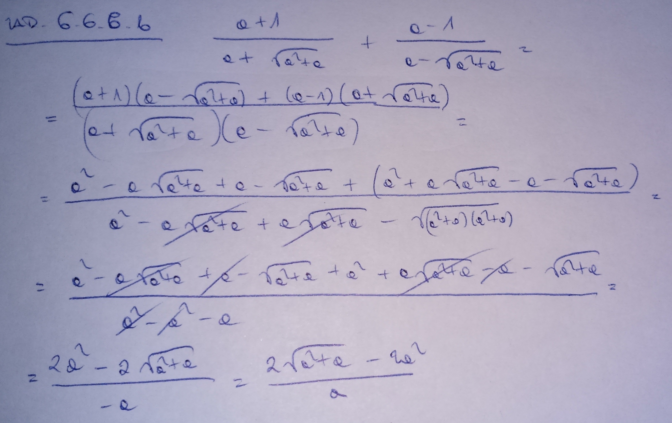 =\frac{(a+1)\left(a-\sqrt{a^2+a} \right )+(a-1)\left(a+\sqrt{a^2+a} \right )}{a^2-a^2 - a}=\frac{2a^2 - 2\sqrt{a^2+a}}{-a}= -2a+\frac{2\sqrt{a^2+a}}{a}==================Proszę umieść 6.6.7 osobno, bo ten tekst staje się za długi!Dodawanie komentarzy zablokowane - Zgłoś nadużycie