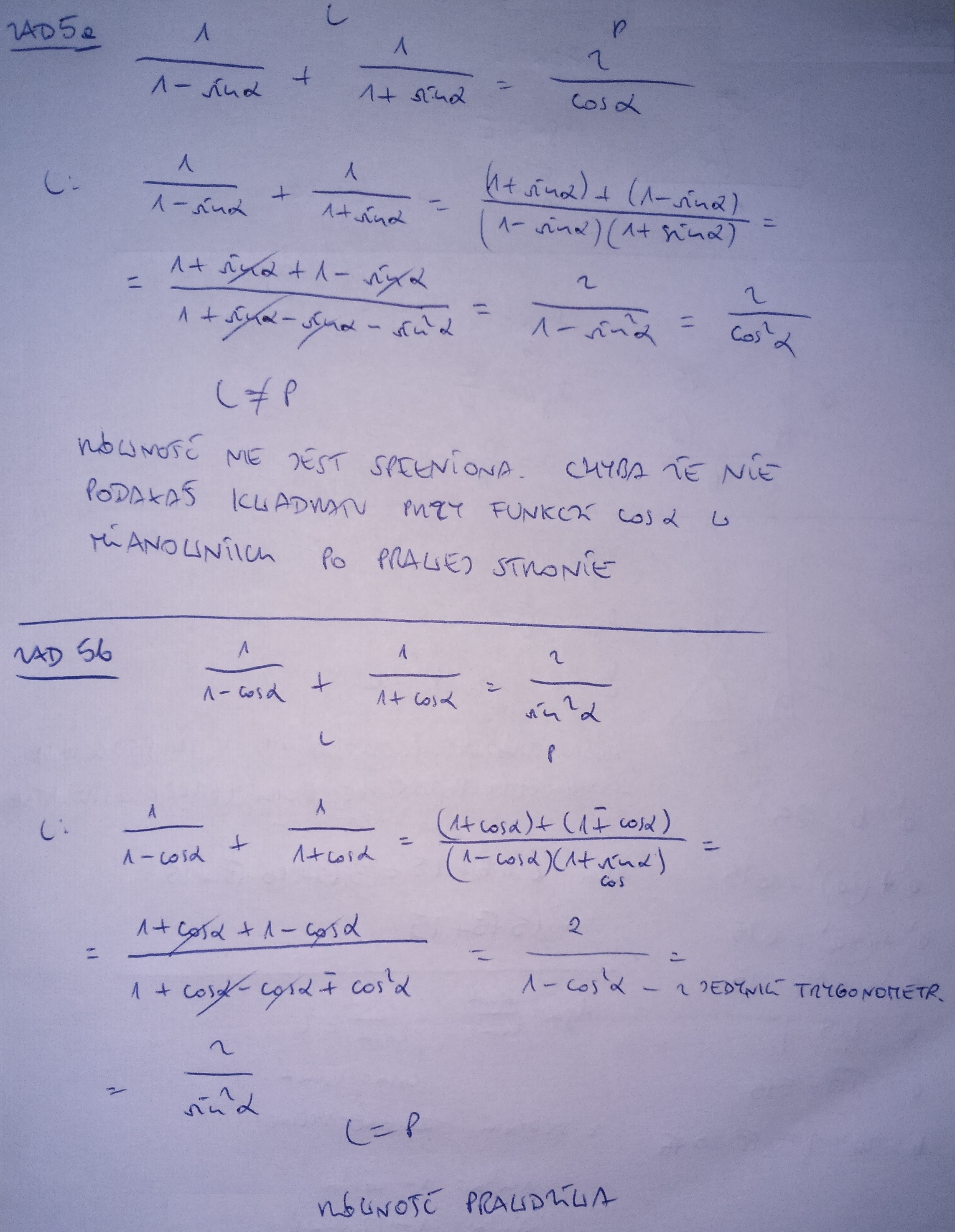 b) 1 / 1- cos alfa + 1 / 1+ cos alfa = 2/ sin ^ 2 alfa