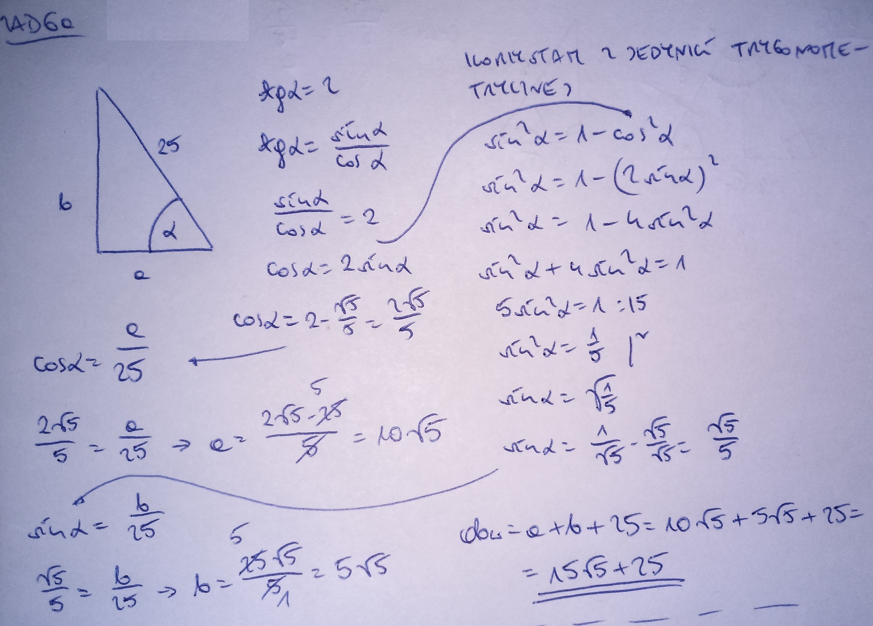 a) W trójkącie prostokątnym tangens konta ostrego alfa wynosi 2 a przeciwprostokątna ma długość 25 cm . Oblicz obwód tego trójkąta