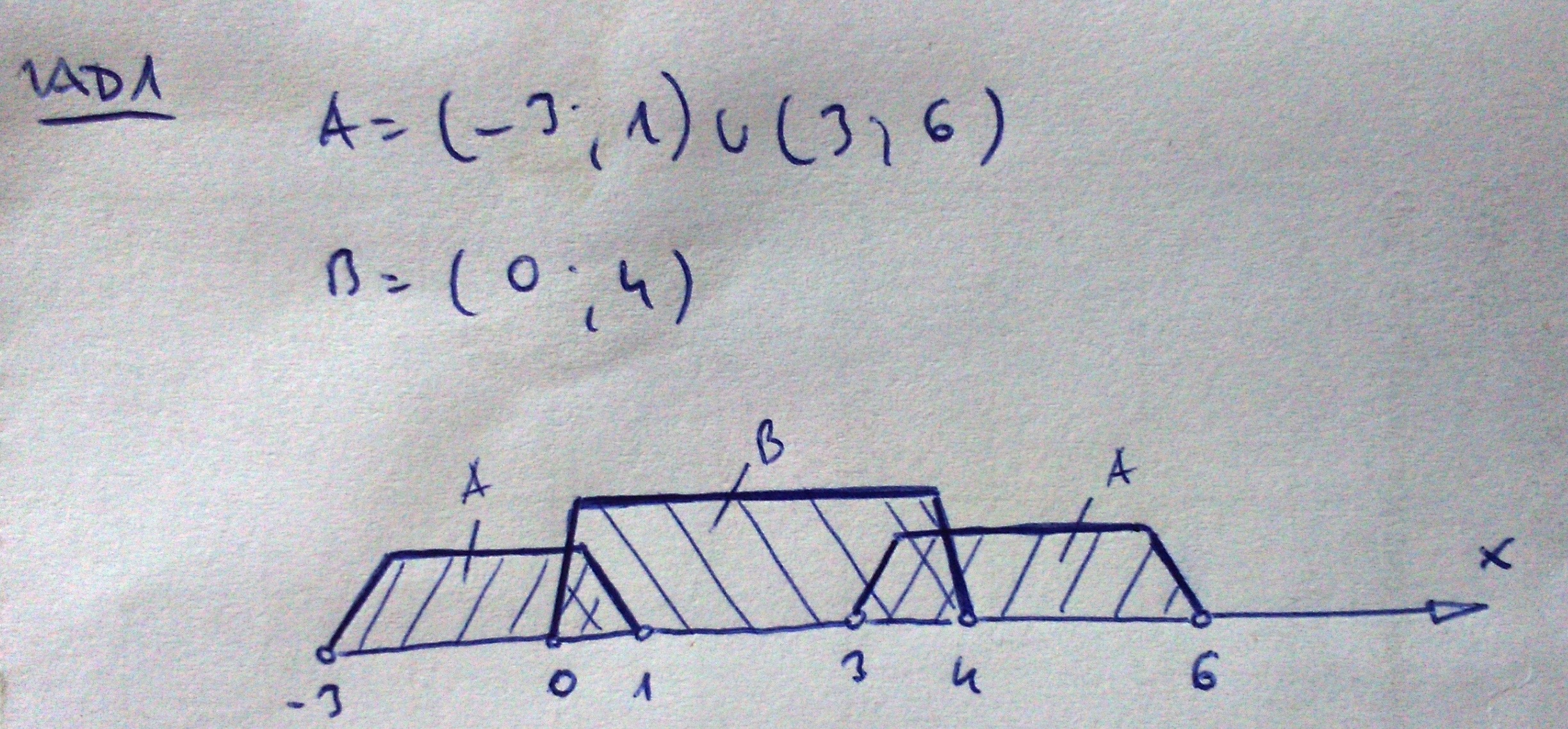 zaznacz na osi liczbowej A i B, i wyznacz zbiory A=(-3,1) U (3,6) B=(0,4)