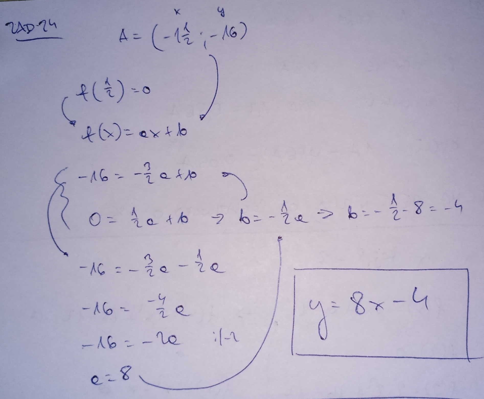 Do wykresu funkcji liniowej należy punkt A = ( - 1 \frac{1}{2}\ ,\ -16) a jej miejscem zerowym jest liczba \frac{1}{2} . Wyznacz wzór tej funkcji.