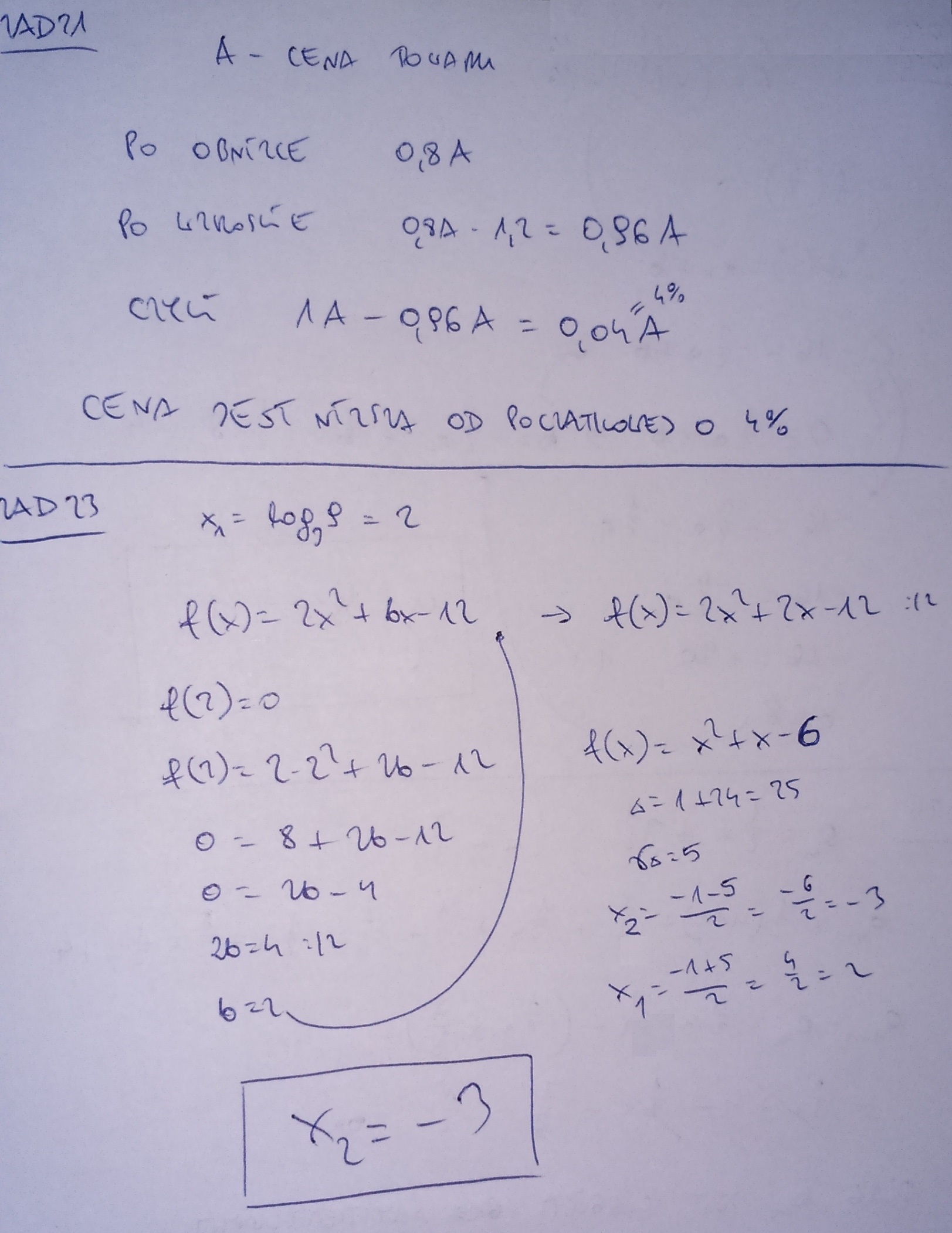 Liczba x1 = log{_3}9 jest miejscem zerowym funkcji f(x) = 2x^2 +\ bx\ -\ 12 . Znajdź drugie miejsce zerowe tej funkcji.