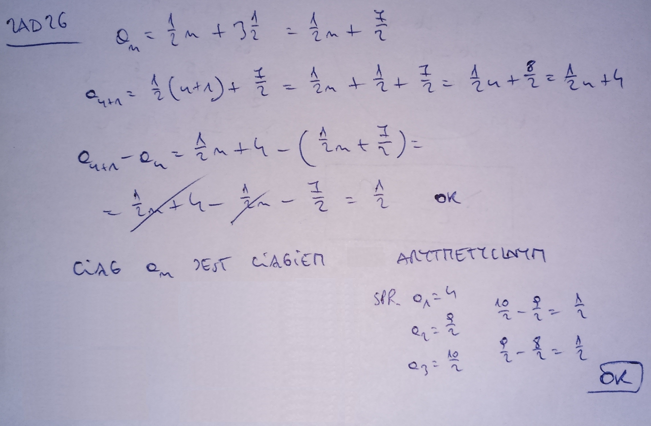 Wykaż, że ciąg a_n\ = \frac{1}{2}n \ +\ 3 \frac{1}{2} jest arytmetyczny.