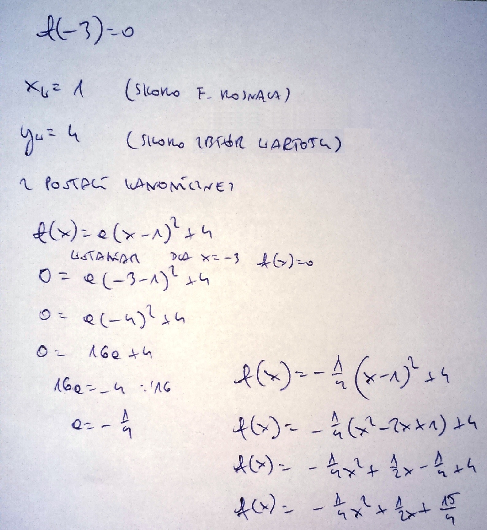 Napisz wzór funkcji kwadratowej f o której wiadomo że f (-3)=0 i przedział (-& ; 1 > jest maksymalnym przedziałem w którym funkcja jest rosnąca , a przedział (-& ; 4 > jest jej zbiorem wartości