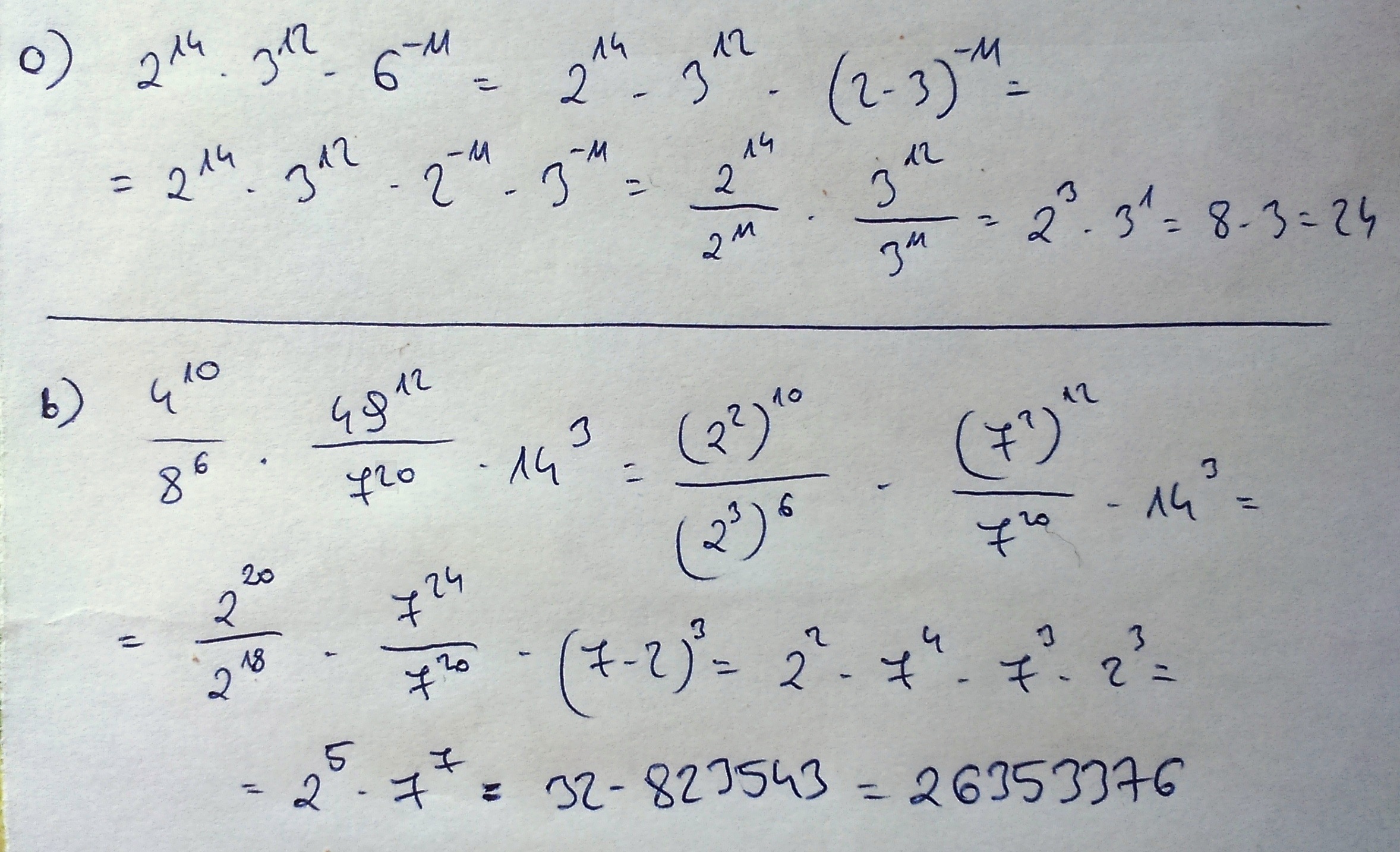 b) 4^10/8^6 * 49^12/7^20*14^3=