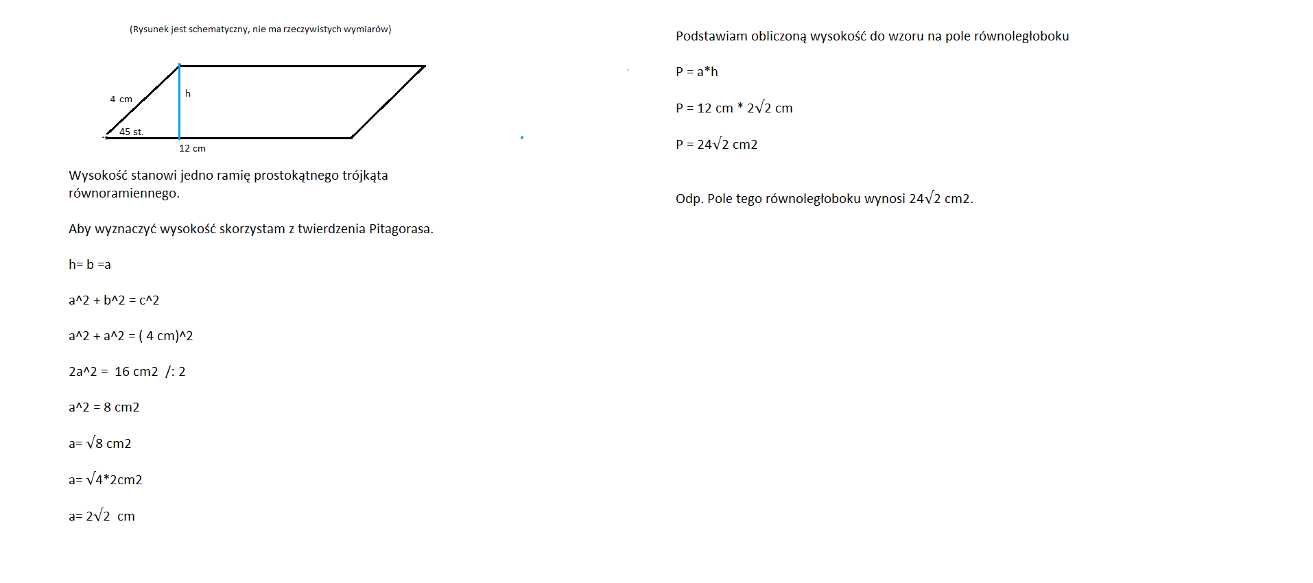 Prostopadłoscienny karton, którego podstawa ma 5 cm i 12 cm długosci całkowicie wypełnia 1,5 litra soku. Wysokosc kartonu wynosi: A 2,5 Cm B 12,5 cm C 25 cm D 5 cm zad2 Równoległobok ma bok dl 4 cm i 12 cm , a kat ostry ma miare 45 stopni Oblicz pole tego równoległoboku