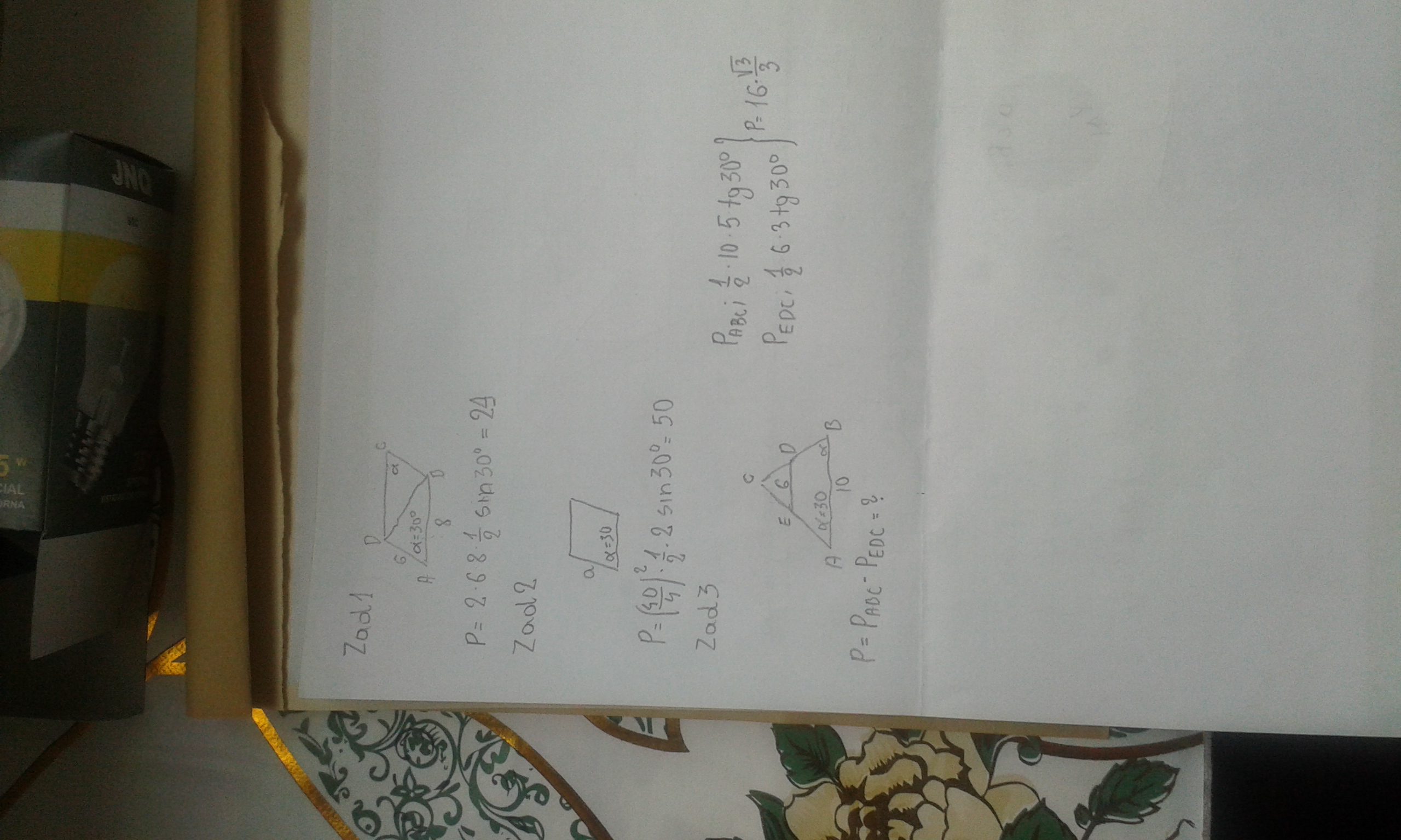 1. Boki równoległoboku mają długość 8 cm i 6 cm, a jego kąt ostry wynosi 30 stopni. Ile wynosi pole tego równoległoboku?