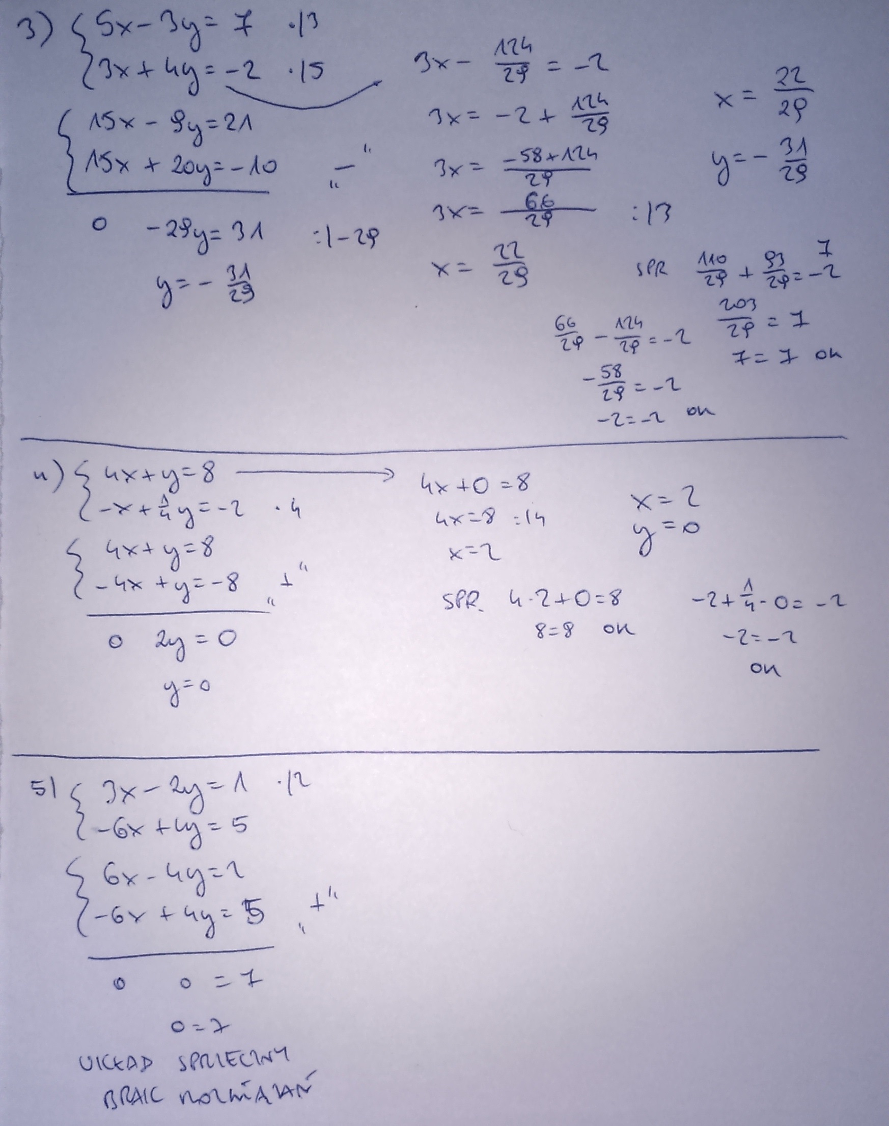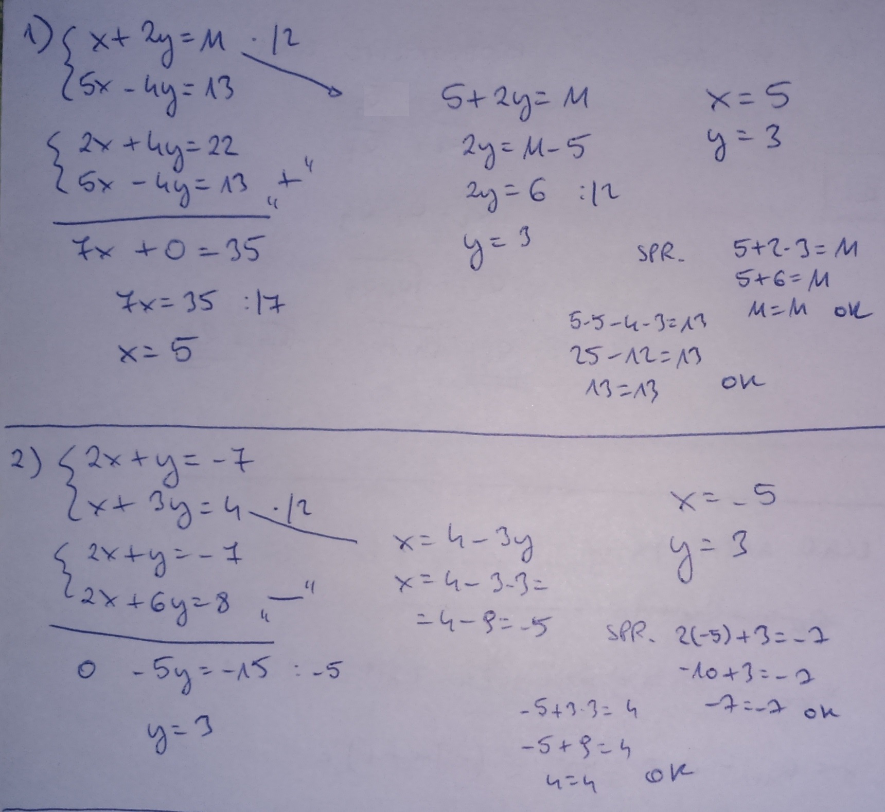 proszę o rozwiązanie układu równań metodą przeciwnych współczynników zad 1 x+2y=11 i 5x-4y=13 zad 2. 2x+y=-7 i x+3y=4 zad 3. 5x-3y=7 i 3x+4y=-2 zad 4. 4x+y=8 i -x+1/4y=-2 zad 5. 3x-2y=1 i -6x+4y=5