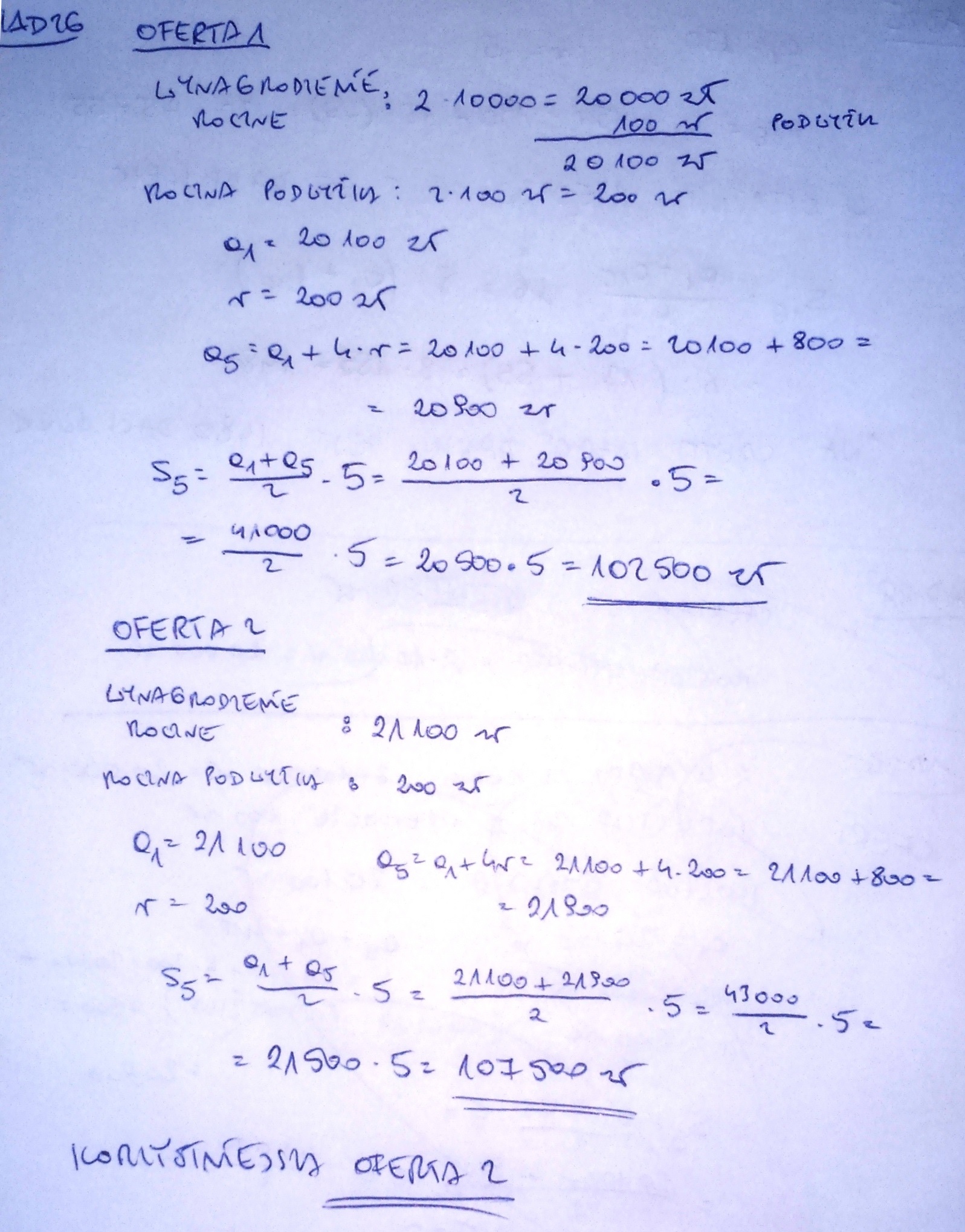 Mamy n = 5 rocznych okresów i ciąg arytmetyczny a_1 = 21100; r = 200.