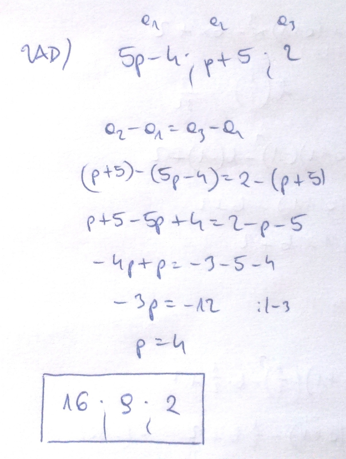 dla jakiej wartości p liczby 5p-4, p+5,2 są kolejnymi wyrazami ciągu arytmetycznego?