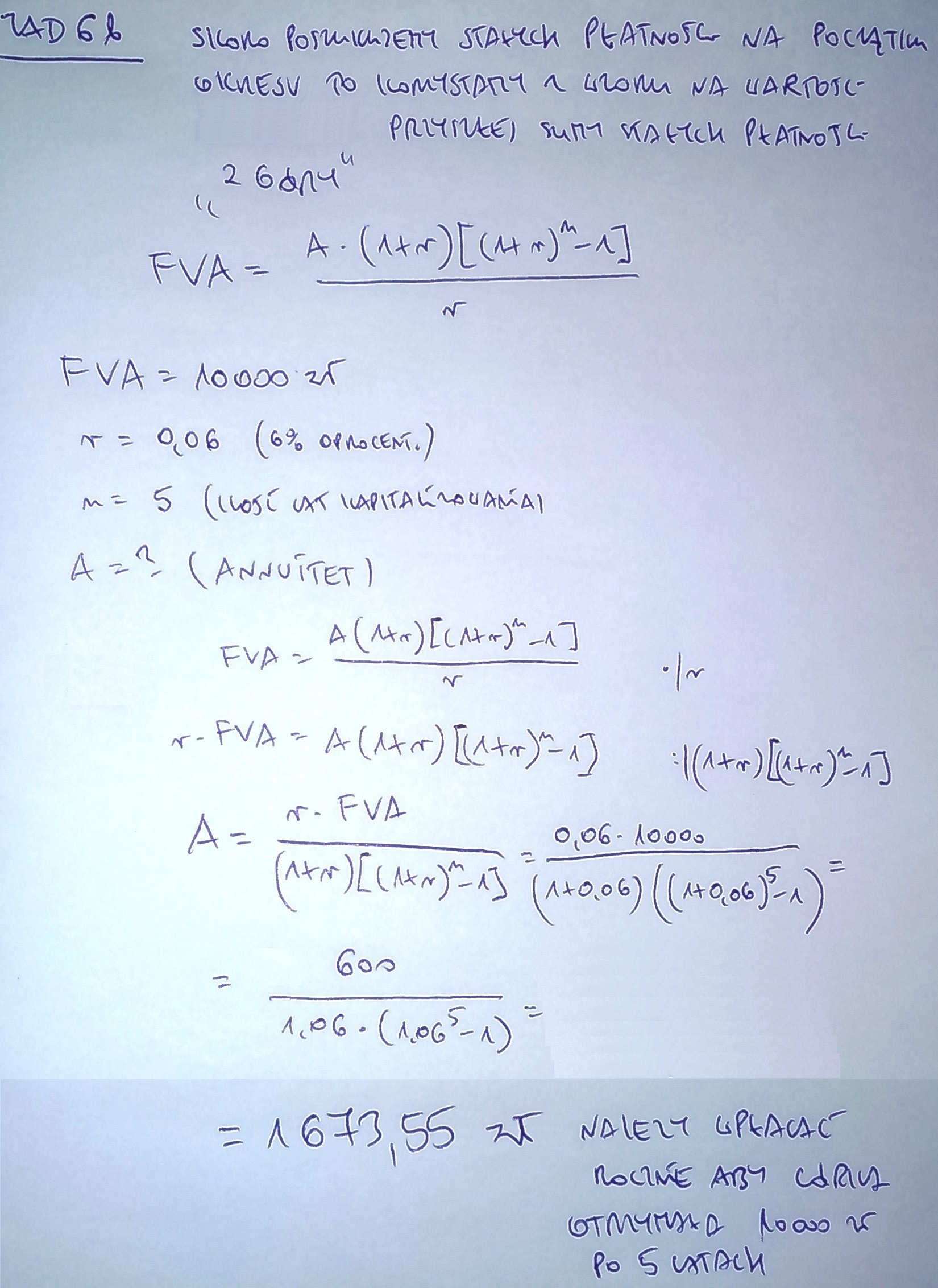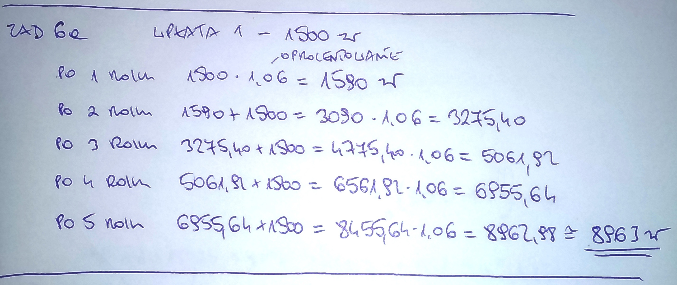 1) Córka pana Stefana kończy za 5 lat 18. rok życia. Pan Stefan chce dać jej w prezencie pewną kwotę pieniędzy – będzie wpłacał na konto (pierwsza płatność już dziś) co roku przez pięć lat 1.500 zł (będzie łącznie 5 wpłat). Oprocentowanie wynosi 6% rocznie.