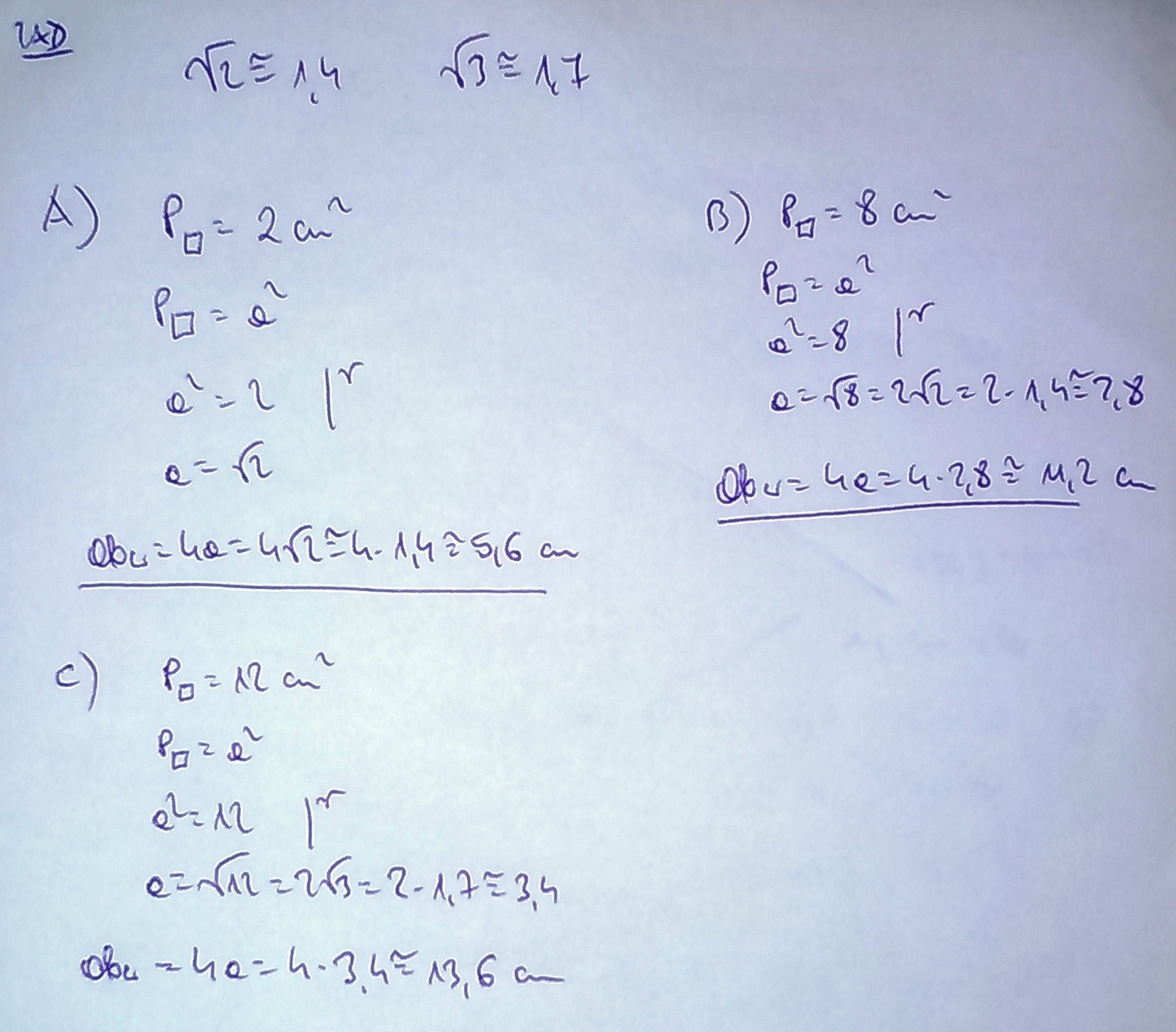 zad 1 P jest polem kwadratu.Oblicz obwód tego kwadratu {w centymetrach} i jego przyblizenie dziesietne przyjmujac pierw2~~1,4 pierw3~~1,7 A P=2cm2 B P=8cm2 C P=12cm2