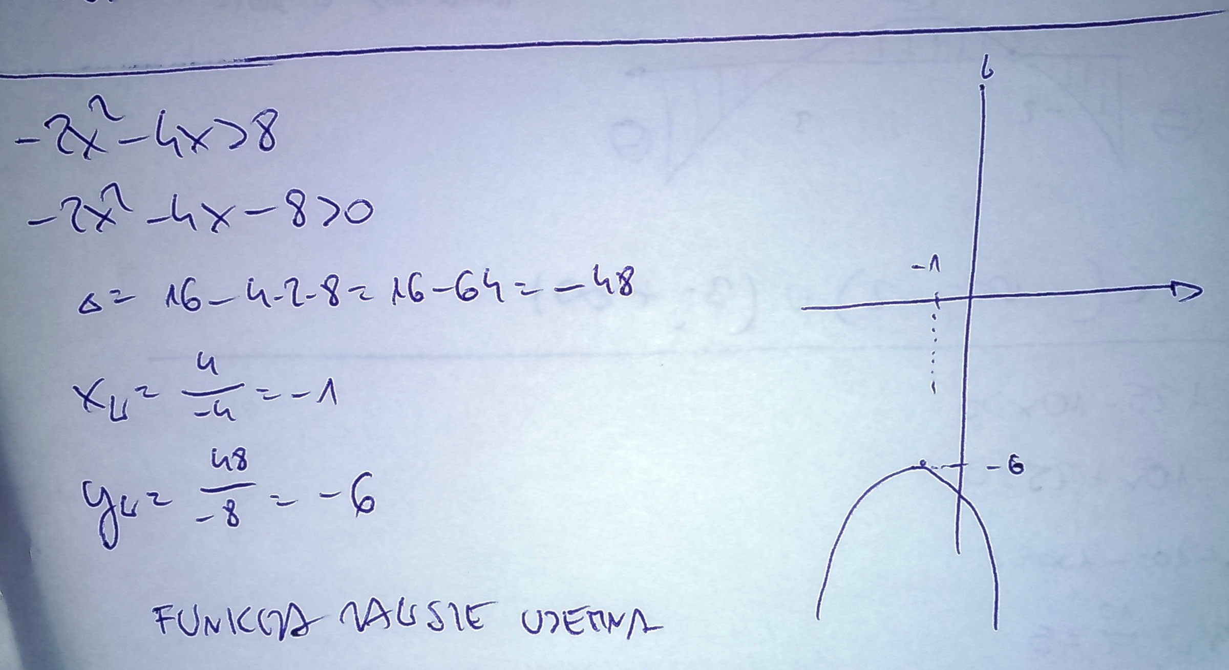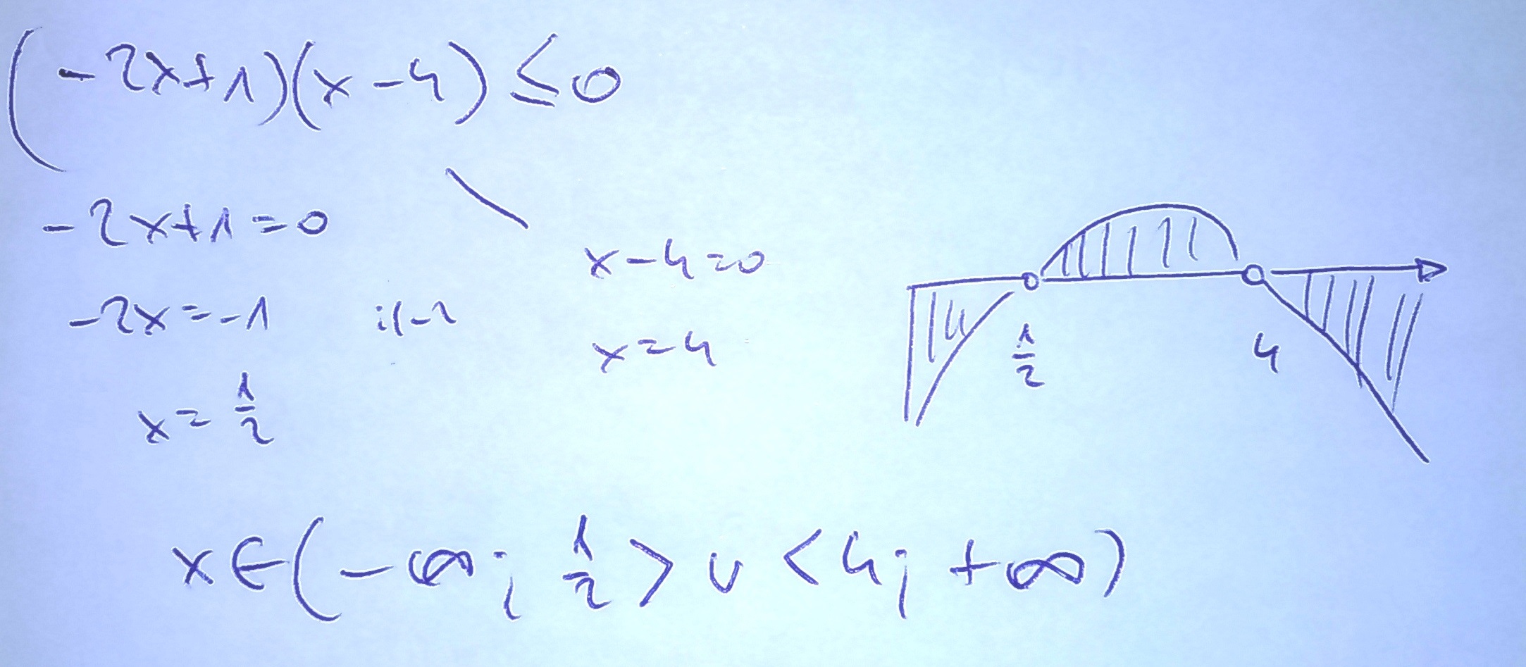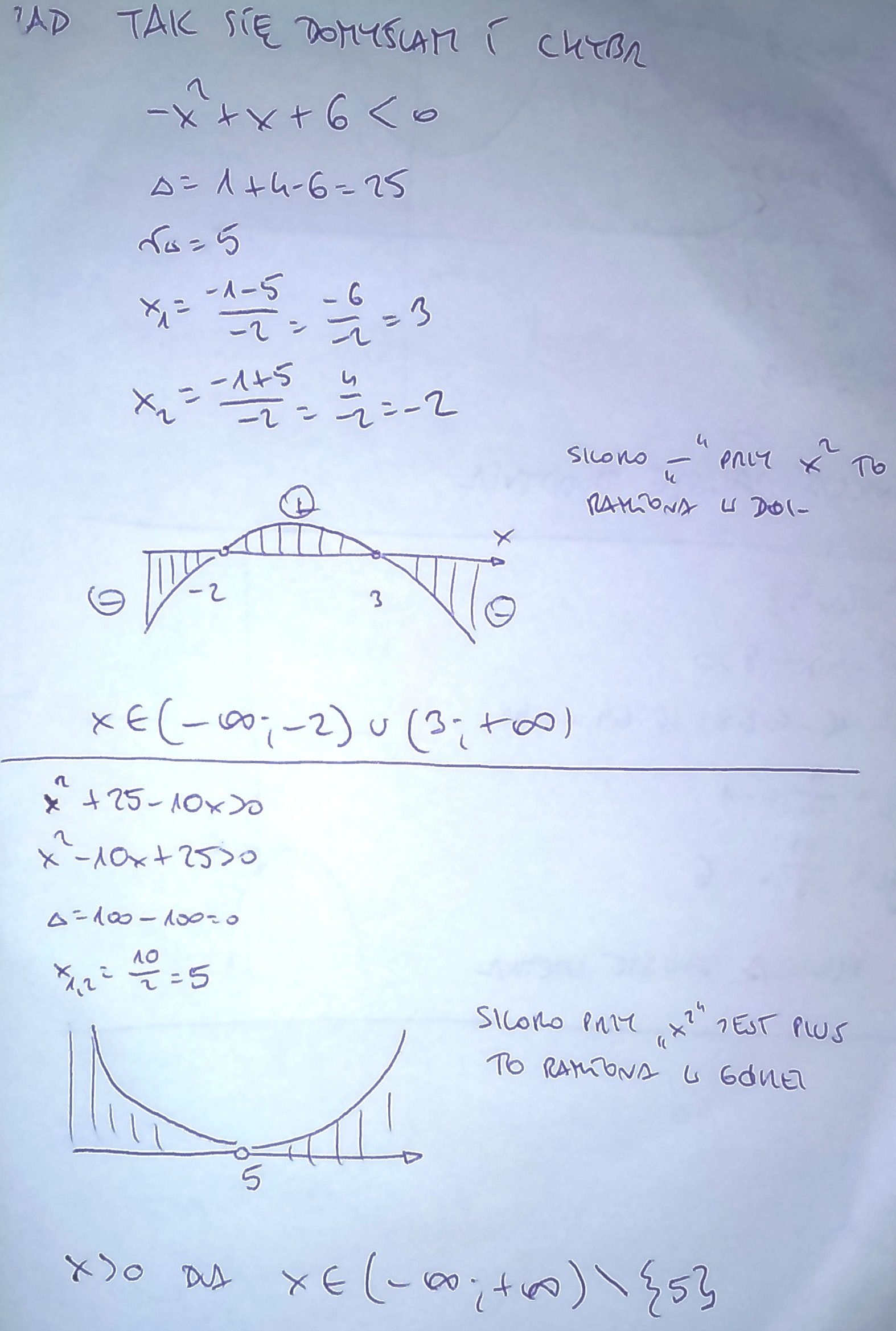 rozwiąż nierówności.-x+x+6<0 x kwadrat+25-10x>0 -2x-4x>8 - {-2x+1}{x-4} rowne lub mniejsze od 0