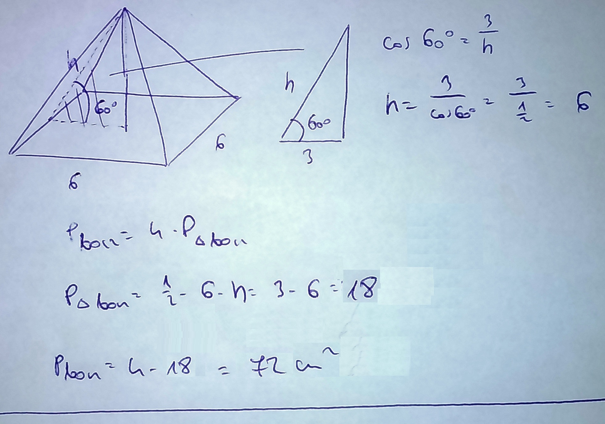 Ściana boczna ostrosłupa prawidłowego czworokątnego o krawędzi podstawy długości 6cm tworzy z płaszczyzną podstawy kąt 60 stopni. Oblicz pole powierzchni bocznej ostrosłupa.