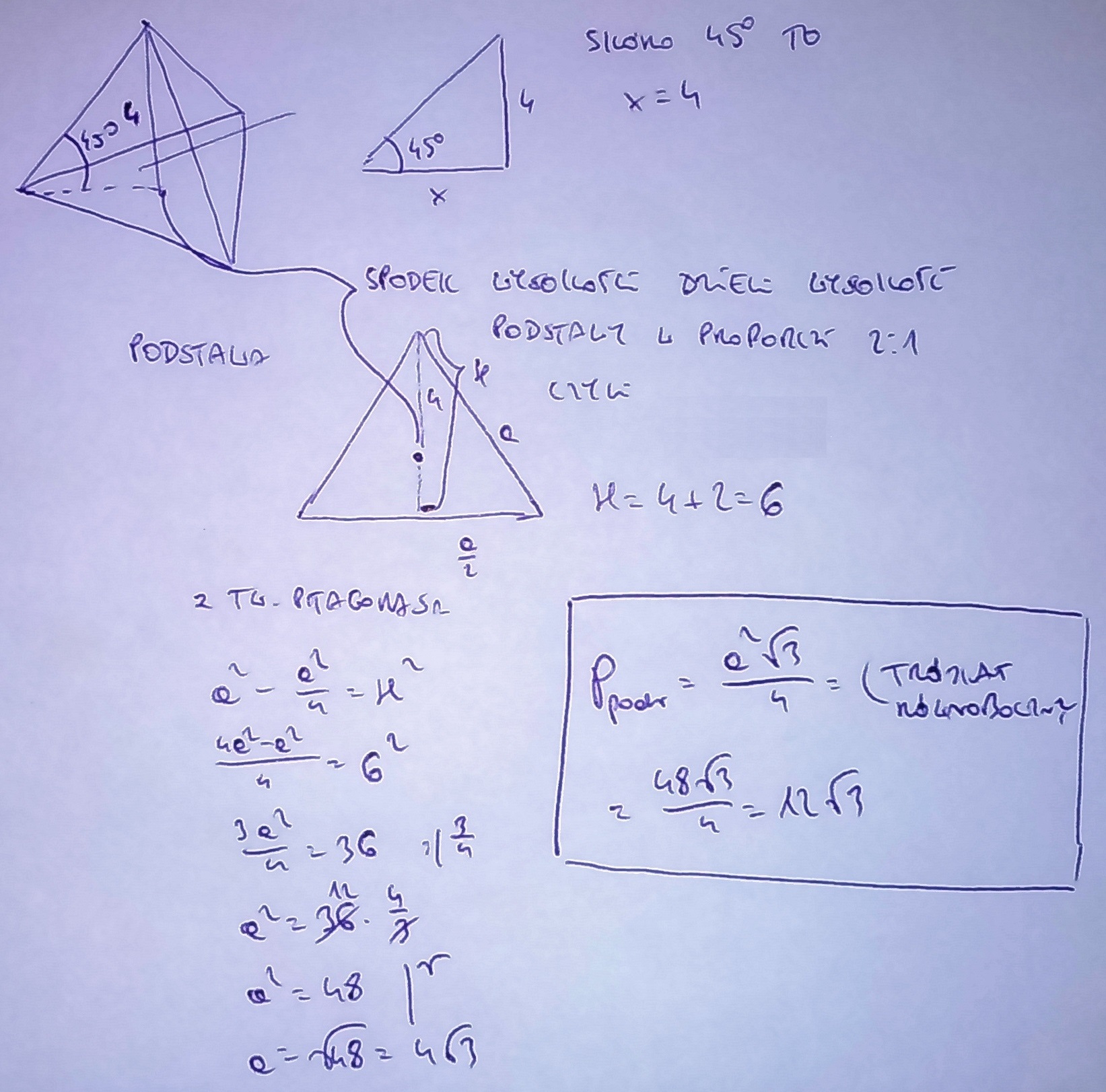 w ostorsłupie prawidłowym trojkątnym krawędź boczna jest nachylona do płaszczyzny podstawy pod kątem 45stopni. Wysokość bryły jest równa 4cm. Oblicz pole podstawy tego ostrosłupa.