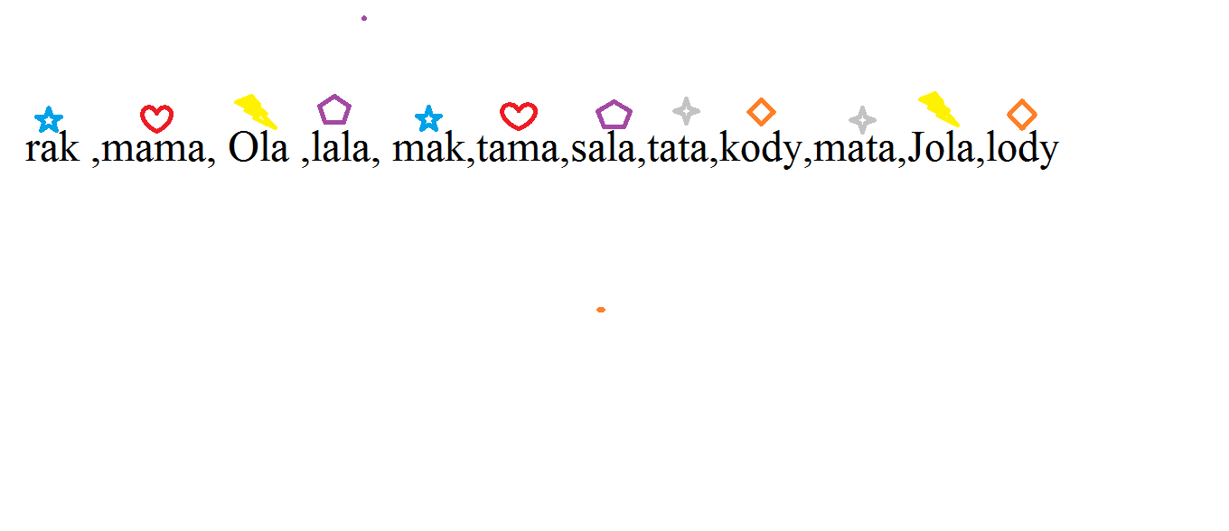 Narysuj takie same znaczki obok par wyrazów,które się rymują przykłady takie są rak ,mama, Ola ,lala, mak,tama,sala,tata,kody,mata,Jola,lody bardzo dziękuję za rozwiązanie zadania