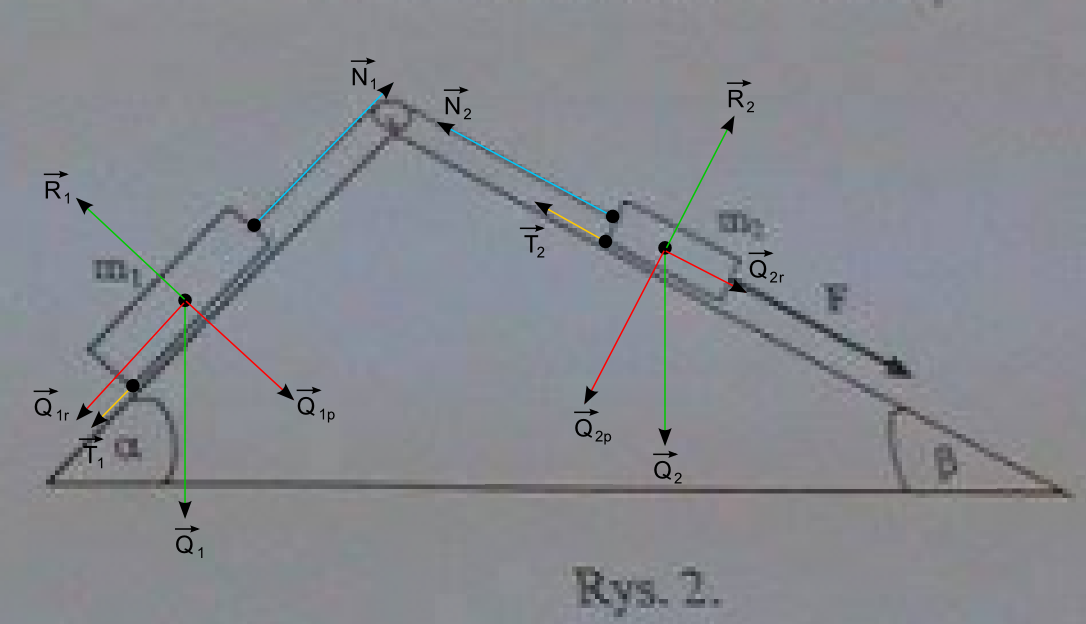 2A. Dany jest układ dwóch ciał o masach m1= 5kg m2= 1kg polaczonych nitka przerzucona przez niewazki blkoczek. Cialo o masie m1 znajduje sie na rowni pochylej o nachyleniu B= 30. Dodatkowo do ciala o masie m2 zostala przyłożona sila zewnetrzna o wartosci F= 60N. Obliczyć przyspieszenie układu przyjmując że wspolczynnik tarcia obydwu ciezarków o podłoze wynosi u= 0,2. Rozwiazanie powinno zawierac odpowiedni rysunek sil dzialajacych na badany uklad.