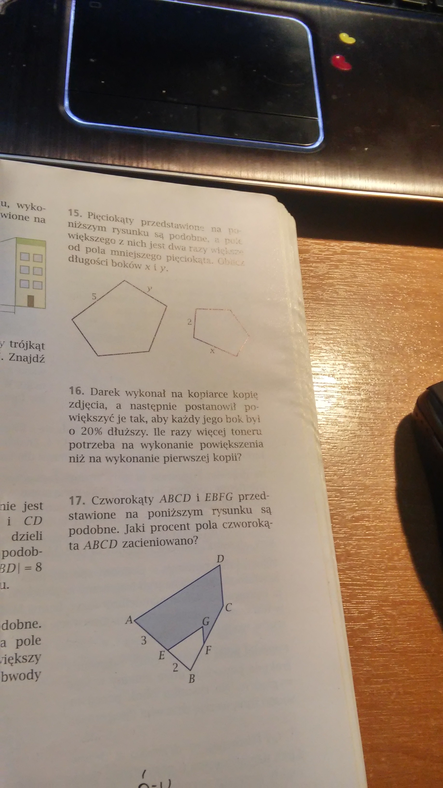 We większym 5-kącie bok 5 jest dłuższy od boku y, czyli odpowiada bokowi x.