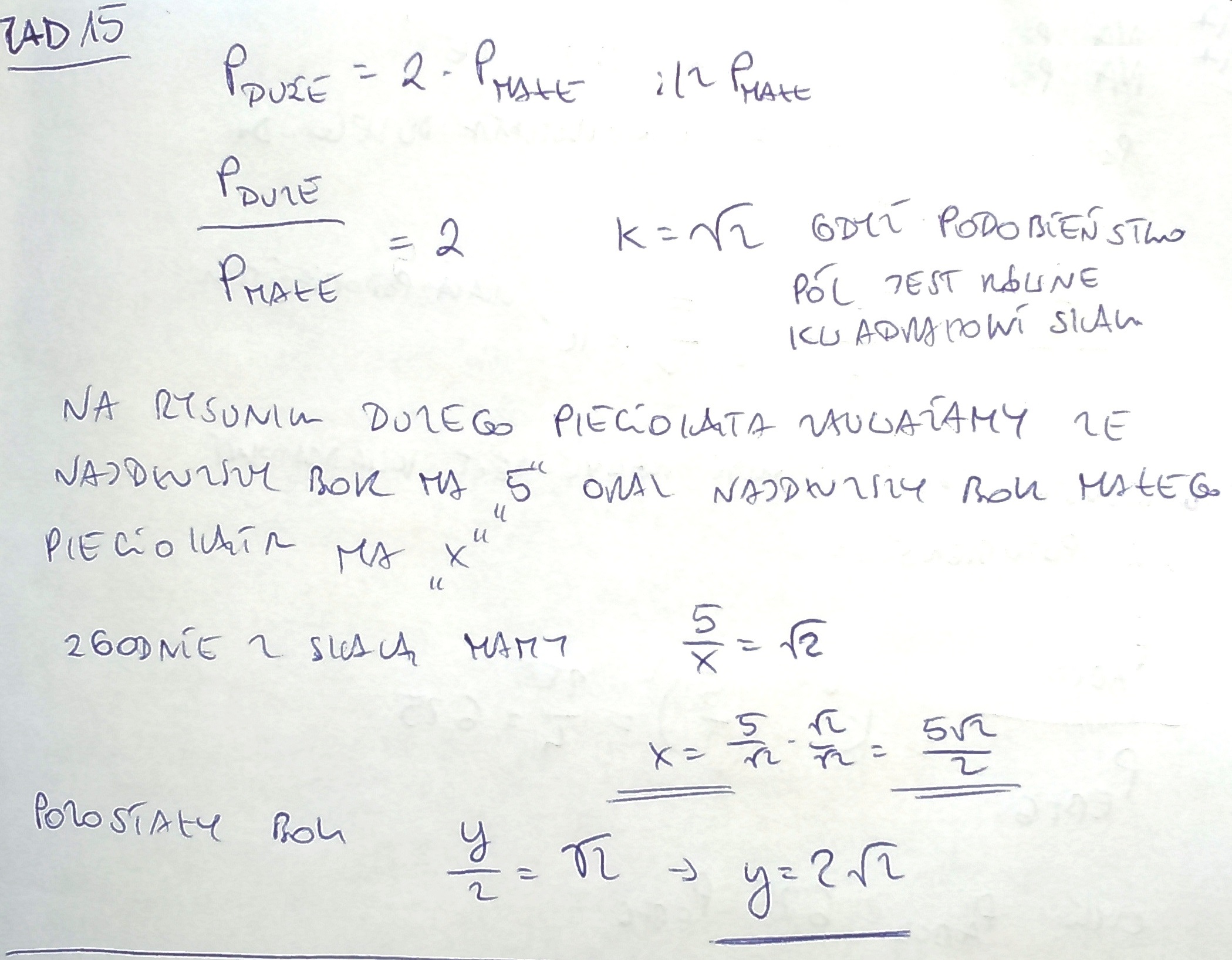 Ponieważ pole większego 5-kąta jest 2 razy większe od pola mniejszego