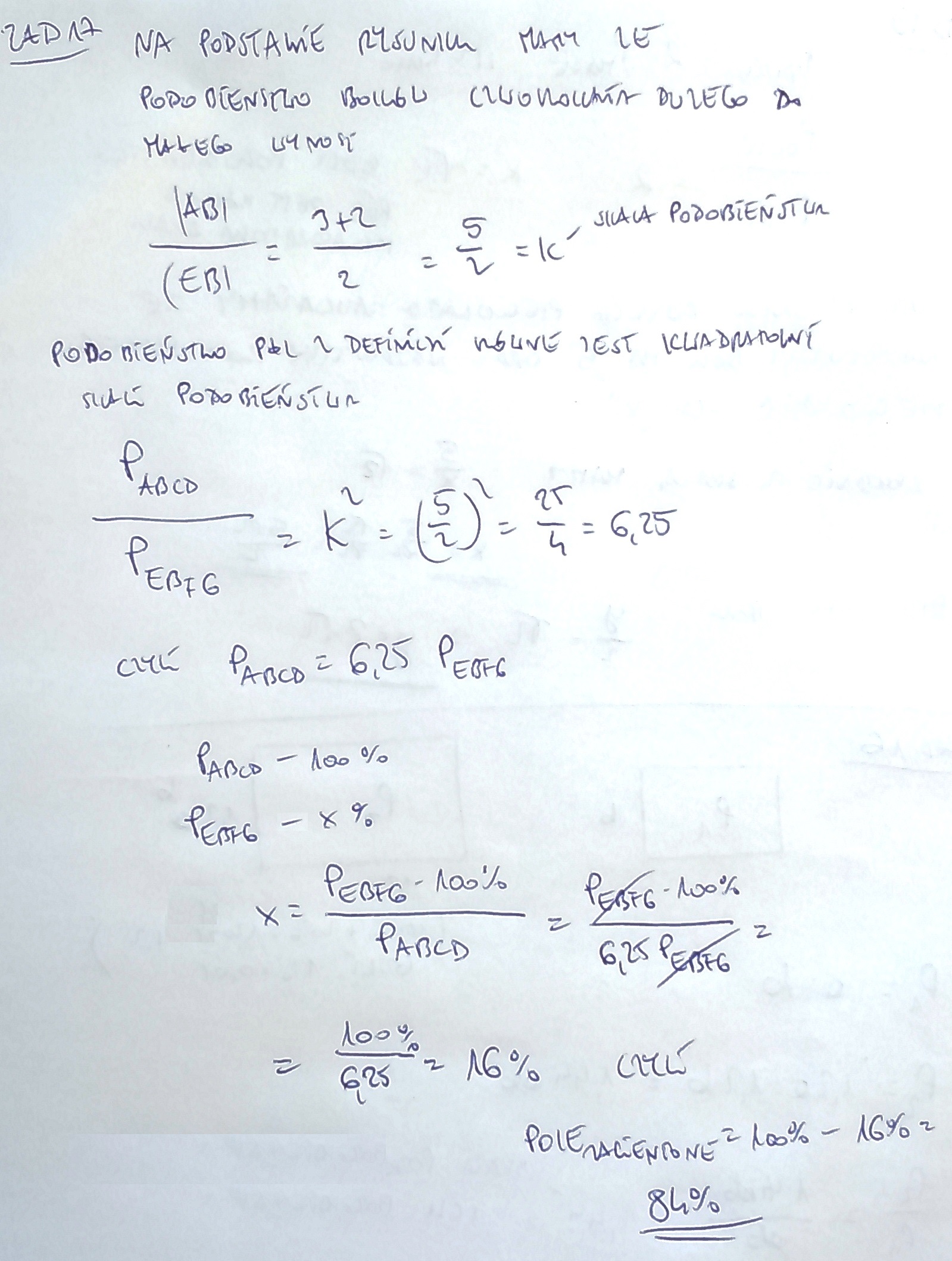 Zacieniowane pole to 100% - 16% = 84% pola czworokąta ABCD.