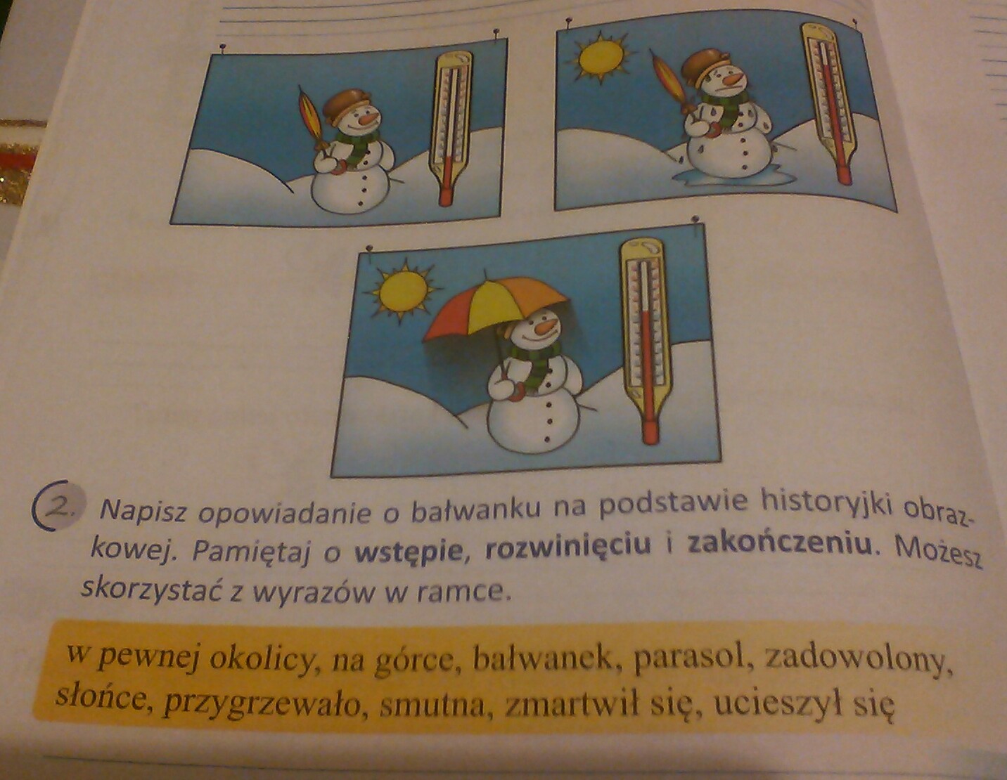 Napisz opowiadanie o bałwanku na podstawie historyjki obrazkowej.Pamiętaj o wstępie,rozwinięciu i zakończeniu.Możesz skorzystać z wyrazów z tabeli.