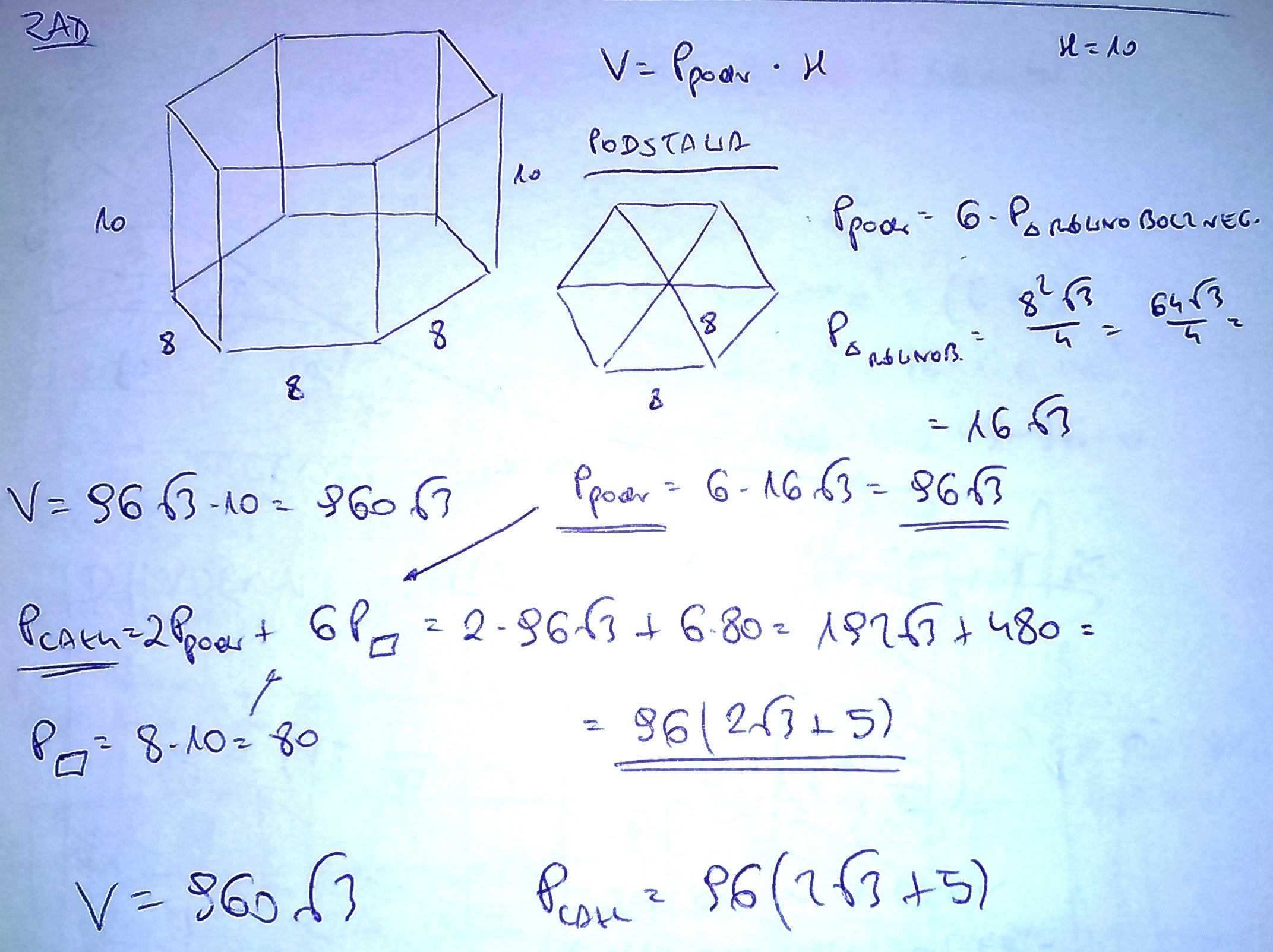 Oblicz pole powierzchni całkowitej i objetosc graniastosłupa prawidłowego szczesciakatnego o krawedzi podstawy 8 i wysokosci 10.