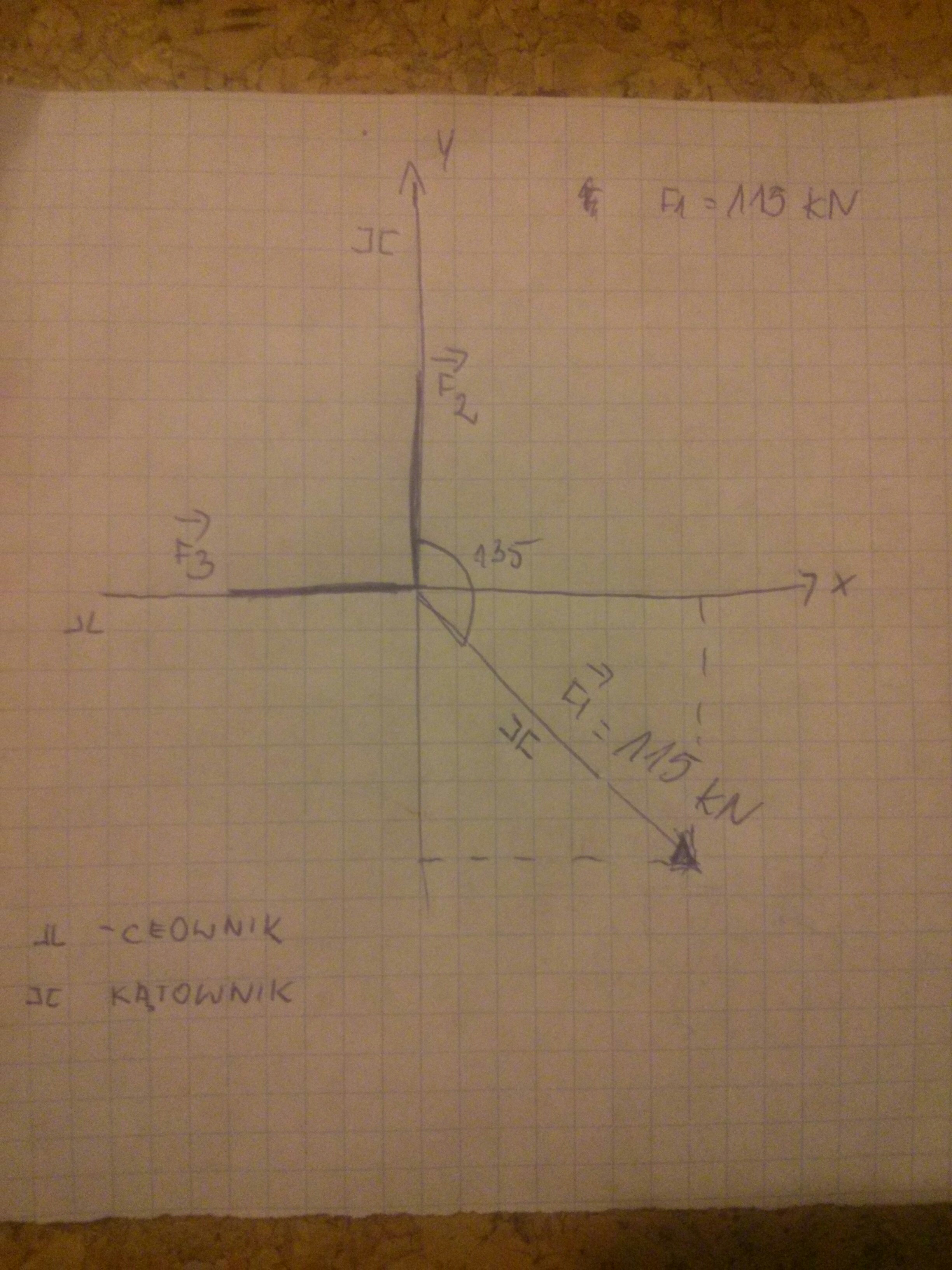 Zaprojektuj węzeł kratownicy nitowanej składającej się z 3 prętów na które działają siły według przedstawionego schematu .
