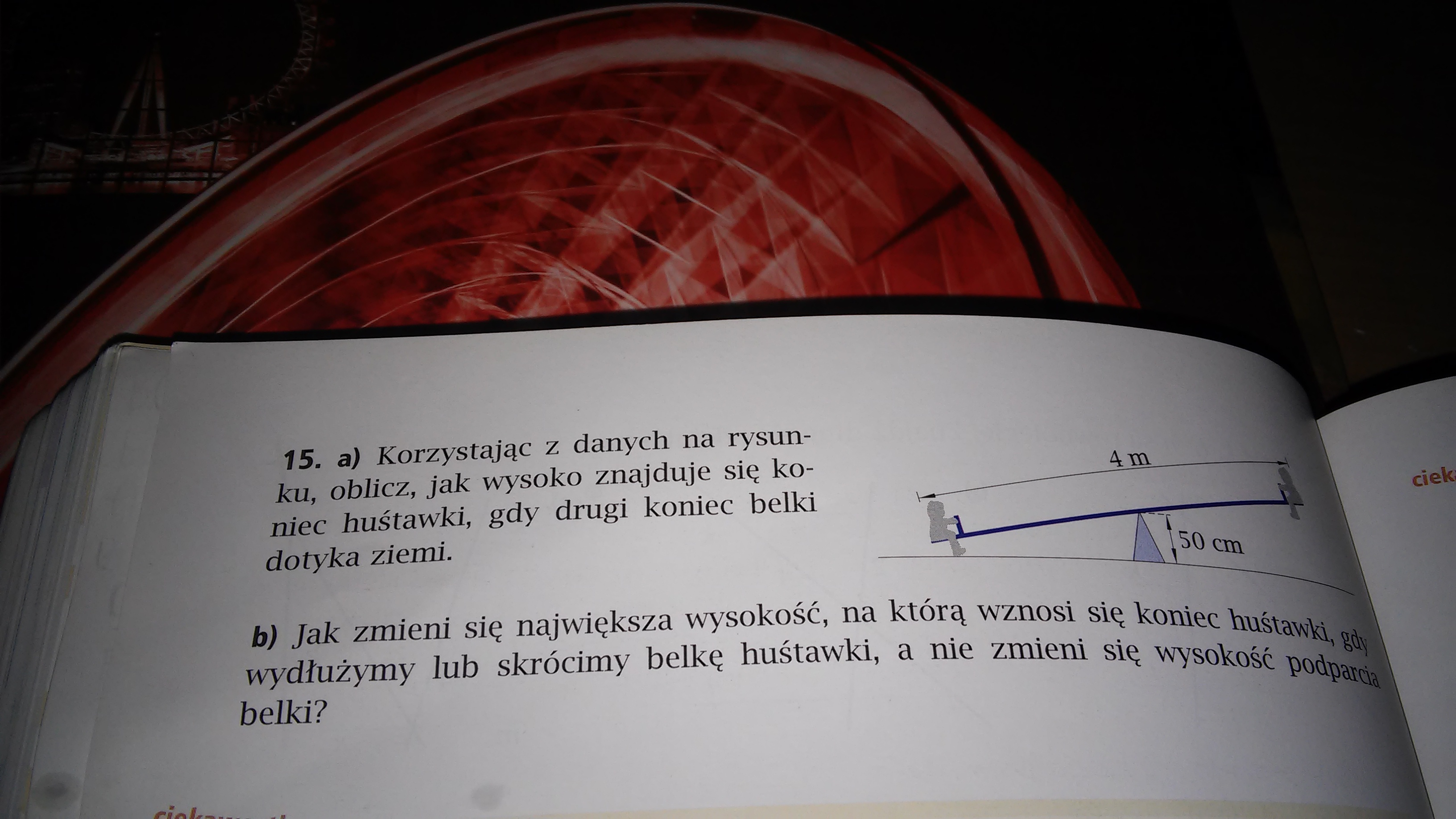 Zakładamy, że huśtawka podparta jest w środku belki, czyli odległość punktu podparcia od miejsca styku belki z ziemią wynosi 4 / 2 = 2 m.