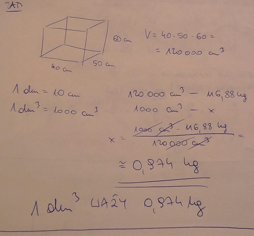 bryła lodu w kształcie prostopadłościanu o wymiarach 40cm,50cm i 60cm waży 116,88kg.Ile waży 1dm3 lodu?