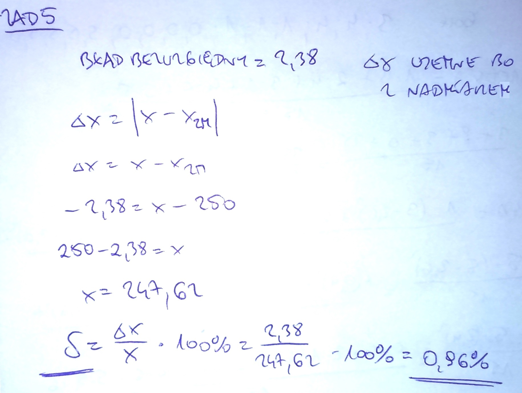 5. Znajdż liczbę, której przyblizenie wynosi 250 wiedząc że jest to przyblizenie z nadmiarem i jego błąd bezwzględny wynos 2,38 oblicz błąd względny tego przybliżenia