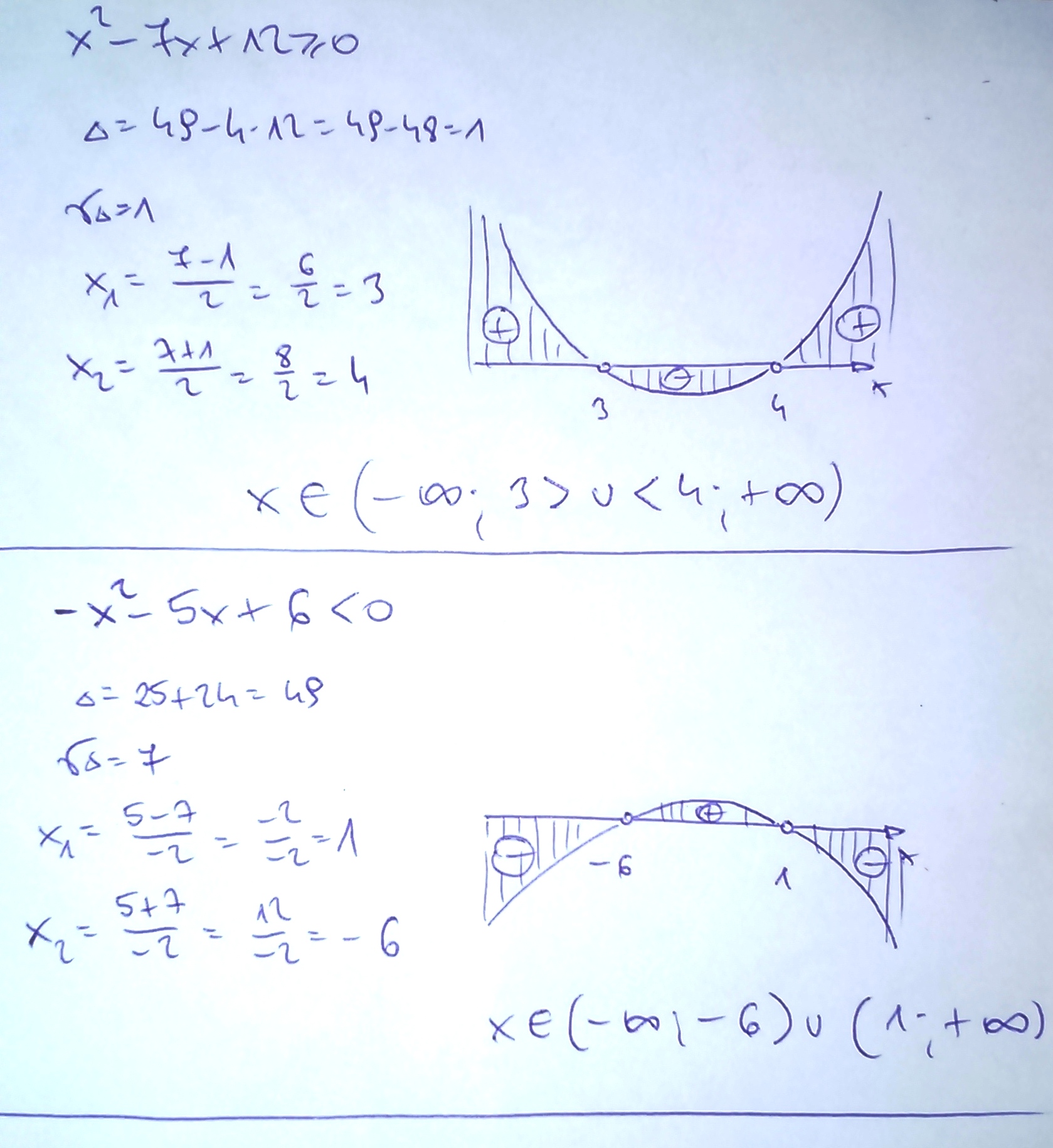 Rozwiąż nierówności x²-7x+12>/0 -x²-5x+6<0