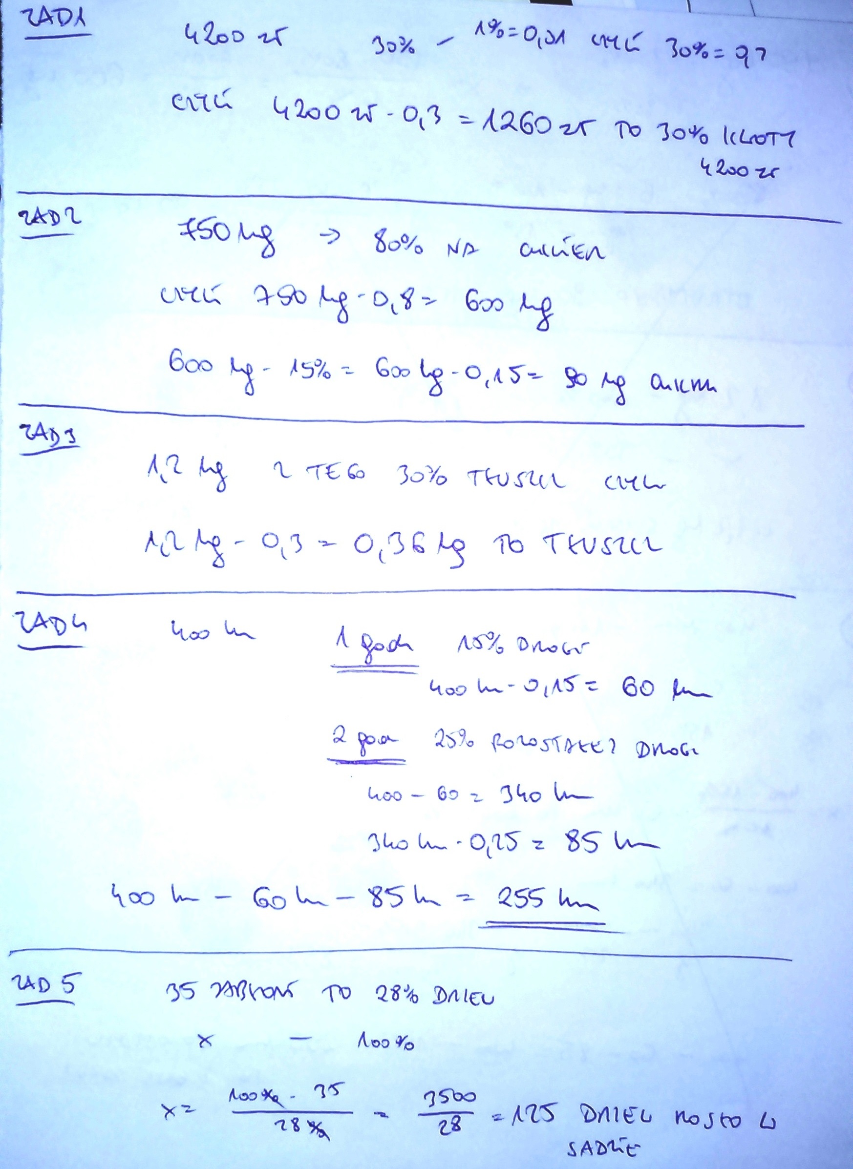 4.Samochód miał do przejechania 400 km.W czasie pierwszej godziny jazdy przebył 15% trasy.W ciągu kolejnej godziny przebył 25% pozostałej drogi.Oblicz ile km pozostało jeszcze do przejechania po dwóch godzinach drogi.
