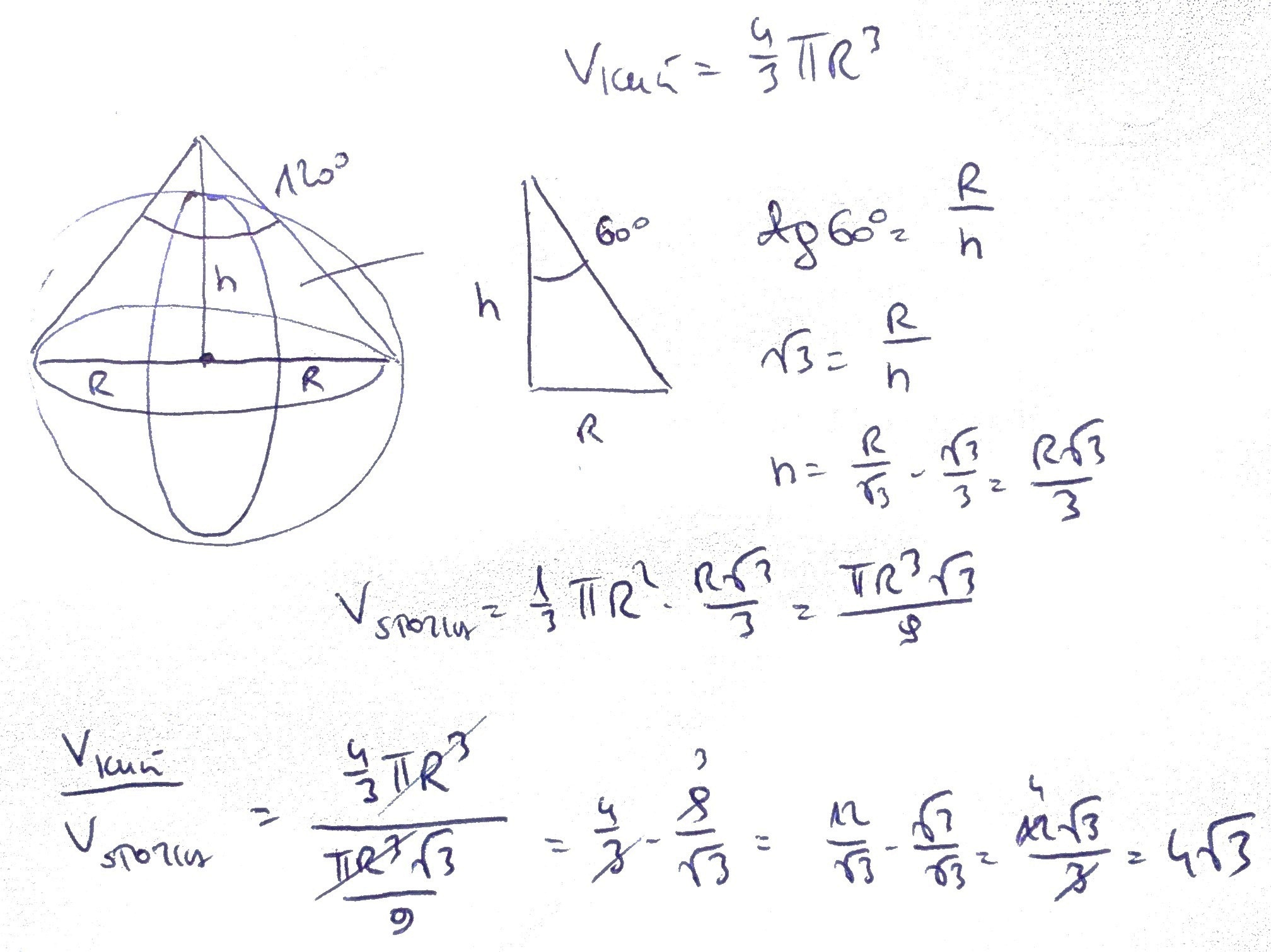Promień kuli jest równy promieniowy podstawy stożka. Oblicz stosunek objętosci kuli do