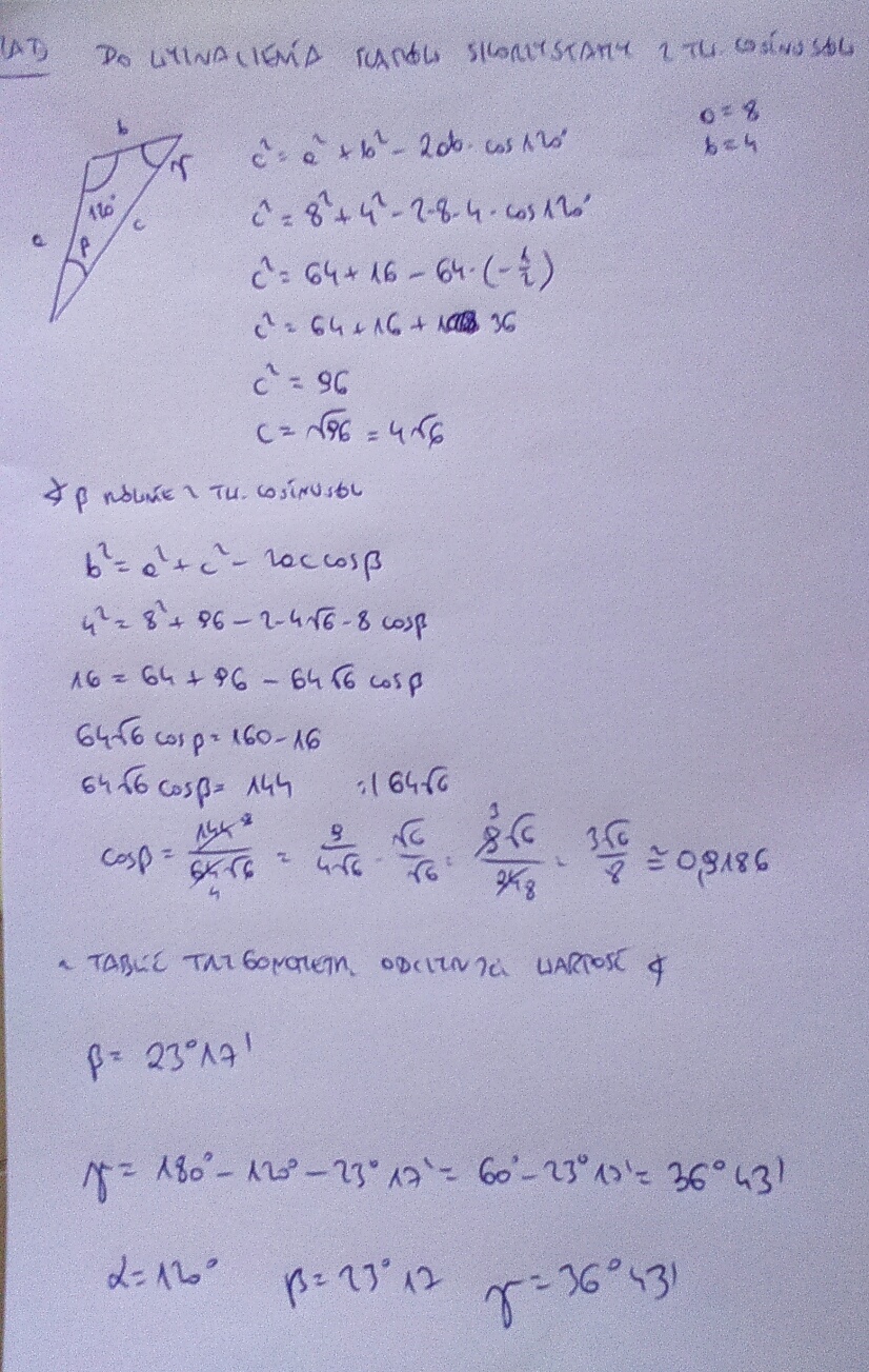 oblicz długości pozostałych boków oraz miary pozostałych kątów trójkąta ABC jeśli a= 8 cm c=4cm kąt beta= 120stopni