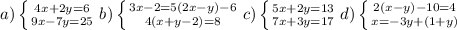 a) 4x + 2y = 6 /*7 9x - 7y = 25 /*2 28x + 14y = 42 18x - 14y = 50 --------------------------- dodaję stronami 28x + 14y + 18x - 14y = 42 + 50 28x + 18x + 14y - 14y = 92 46x= 92 x= 92 : 46 x= 2 4x + 2y = 6 4*2 + 2y = 6 8 + 2y = 6 2y = 6 - 8 2y = - 2 y = -2 : 2 y = -1 spr. 9x - 7y = 25 L= 9x - 7y = 9*2 - 7*(-1) = 18 + 7 = 25 P= 25 25=25 L=P b) 3x - 2 = 5(2x- y) - 6 4(x +y -2) = 8 3x - 2 = 10x - 5y - 6 4x + 4y - 8 = 8 3x -10x + 5y = - 6 +2 4x + 4y = 8 + 8 -7x + 5y = - 4 /*4 4x + 4y = 16 /*7 - 28x + 20y = - 16 28x + 28y = 112 --------------------------------- dodaję stronami -28x + 20y +28x + 28y = - 16 + 112 -28x + 28x + 20y + 28y = 96 48y = 96 y = 96 : 48 y = 2 4(x +y -2) = 8 4(x + 2 - 2) = 8 4x = 8 x= 8 : 4 x= 2 spr. 3x - 2 = 5(2x- y) - 6 L= 3x- 2= 3*2 - 2= 6 - 2= 4 P= 5(2x- y) - 6 = 5(2*2 - 2) - 6= 5(4-2) - 6 = 5*2 - 6= 10 - 6= 4 4=4 L=P c) 5x + 2y = 13 /*(-3) 7x + 3y = 17 /*2 - 15x - 6y = - 39 14x + 6y = 34 -------------------- -15x - 6y + 14x + 6y = - 39 + 34 -15x + 14x - 6y + 6y = - 5 - x= - 5 /*(-1) x= 5 5x + 2y = 13 5*5 + 2y = 13 25 + 2y = 13 2y = 13 - 25 2y = - 12 y= - 12 : 2 y = - 6 spr. 7x + 3y = 17 L= 7x + 3y = 7 * 5 + 3*(-6) = 35 - 18 = 17 P= 17 17=17 L=P d) 2(x-y) - 10 = 4 x= - 3y + (1+ y) 2x-2y - 10 = 4 x= - 3y +1+y 2x- 2y = 4 + 10 x= -2y + 1 2(-2y+1) - 2y = 14 x= - 2y +1 -4y + 2- 2y = 14 x= -2y +1 -6y = 14 - 2 x= - 2y +1 -6y = 12 x= - 2y +1 y = 12 : (-6) x= - 2y +1 y = - 2 x= -2*(-2) +1 y= -2 x =4 +1 y= -2 x = 5 spr. x= - 3y + (1+ y) L= 5 P= -3y +(1 + y) = -3*(-2) + (1 -2) = 6 +(-1) = 6-1= 5 5=5 L=P