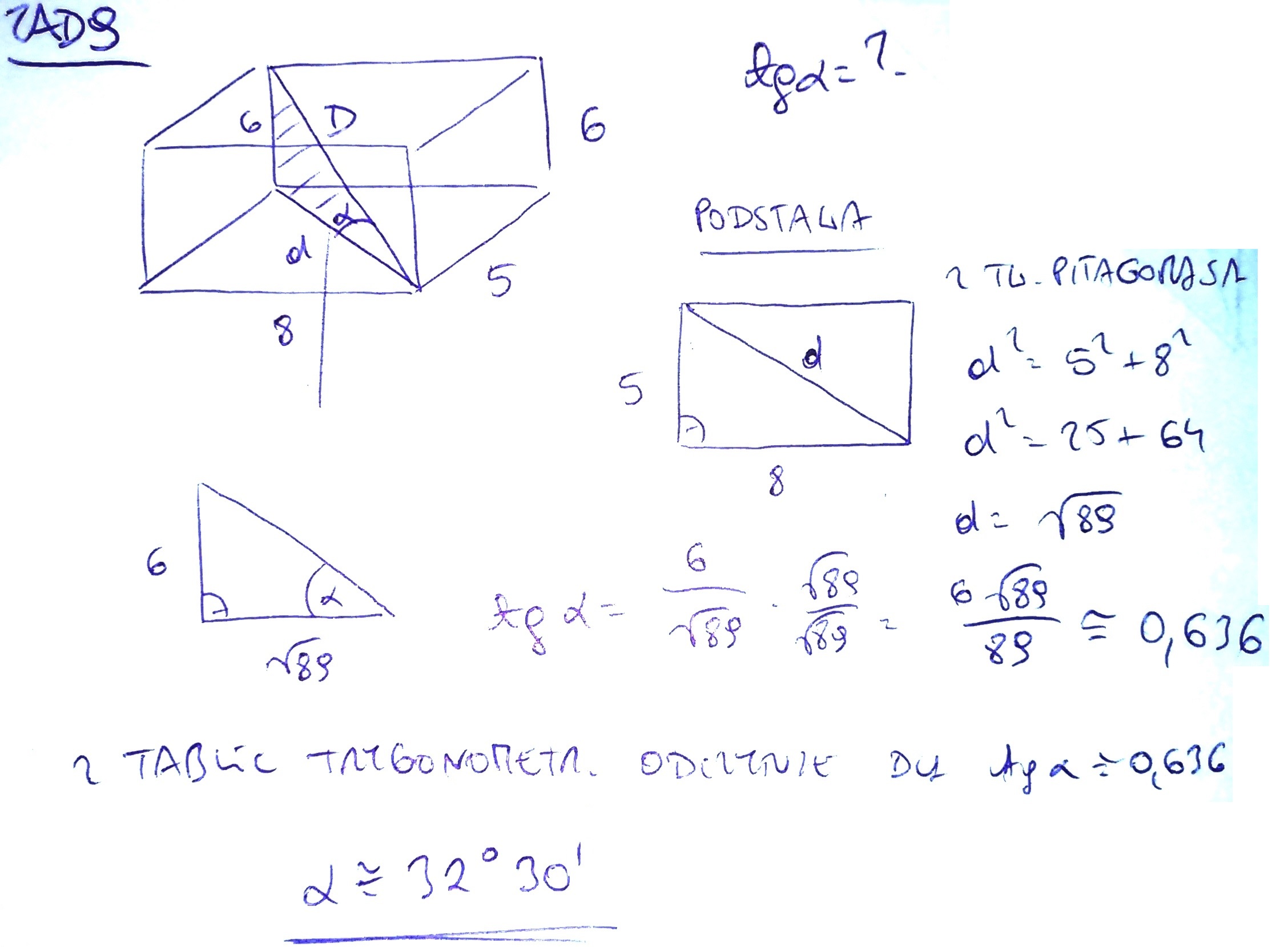 zad9 Podstawą prostopadłościanu jest prostokąt o bokach 5cm i 8cm. Wysokość prostopadłościanu wynosi 6cm. Oblicz tangens kąta, jaki tworzy przekątna podstawy z przekątną prostopadłościanu, które wychodzą z jednego wierzchołka. Odczytaj z tablic wartości funkcji trygonometrycznych miarę tego kąta.