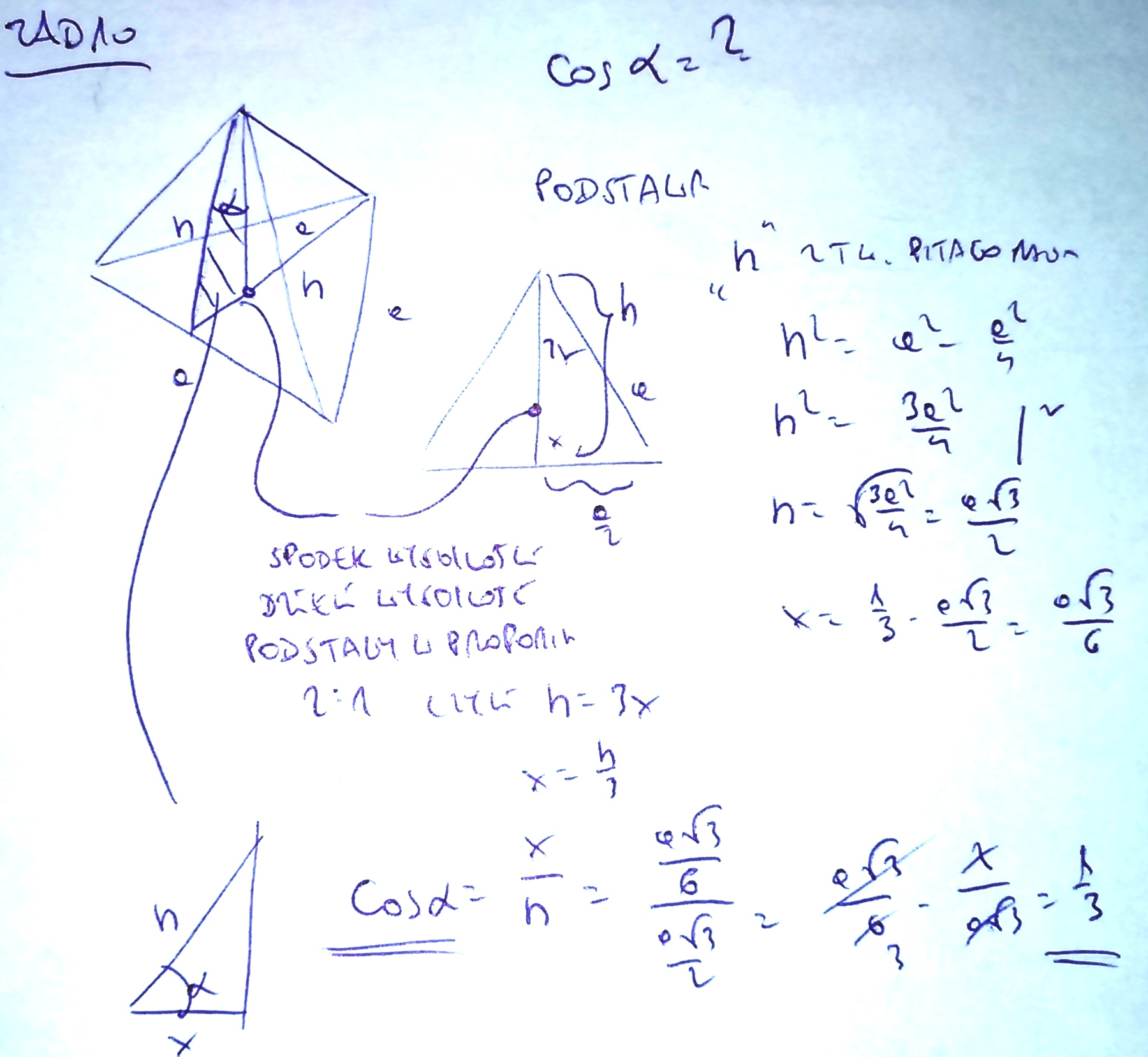 zad10 Oblicz cosinus kąta, jaki tworzy wysokość czworościanu foremnego z wysokością ściany bocznej, które wychodzą z jednego wierzchołka.